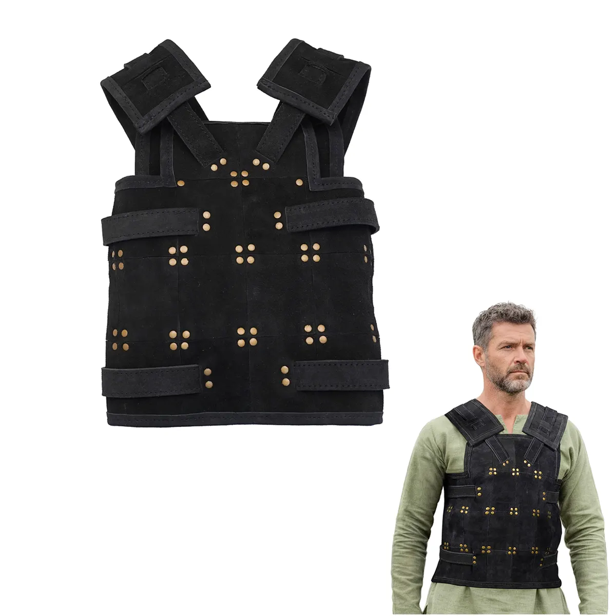 Note: This armor is fully handcrafted from natural suede leather. Small variations in color, texture, rivet placement, and stitching are normal and make it look truly authentic.