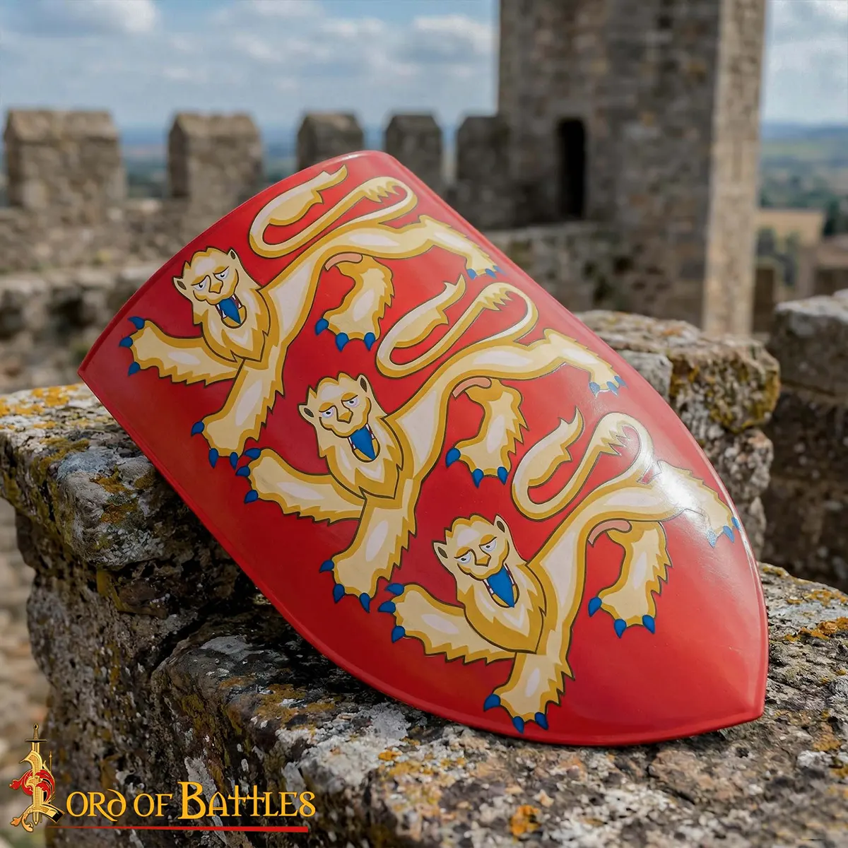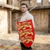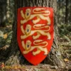 This Richard the Lionheart Shield is crafted from durable 18 gauge steel, and shows the iconic heraldry of medieval England. The front has the famous three golden lions on a red background, a symbol associated with King Richard I.