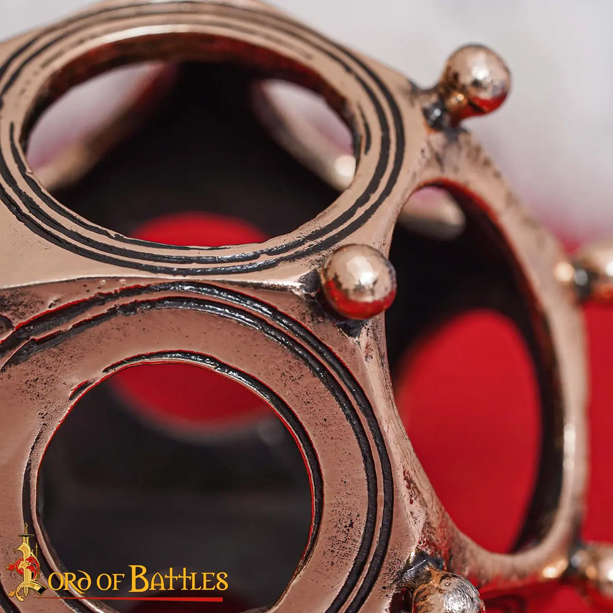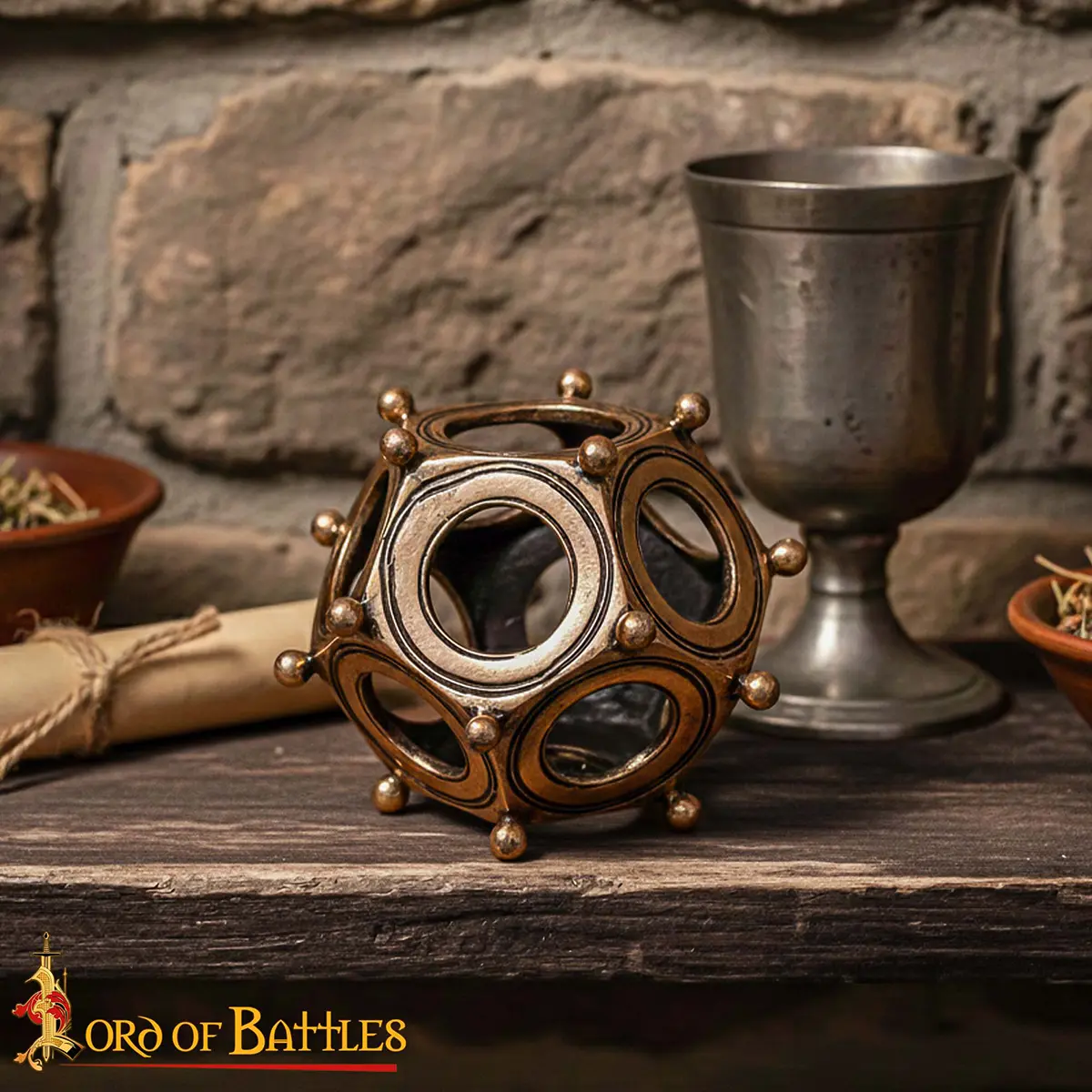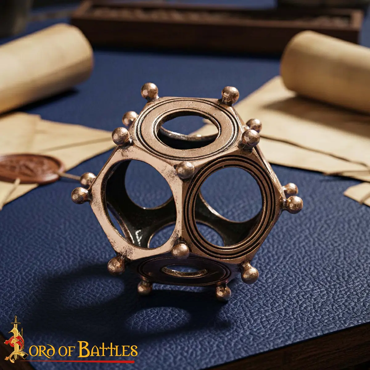 Made from solid bronze, this dodecahedron bronze replica has twelve pentagonal faces with circular openings and evenly spaced knobs at each vertex. Its compact size of approximately 6.8 × 6.5 × 6.5 cm makes it perfect for display on desks, shelves, or in a curated collection of historical artifacts.