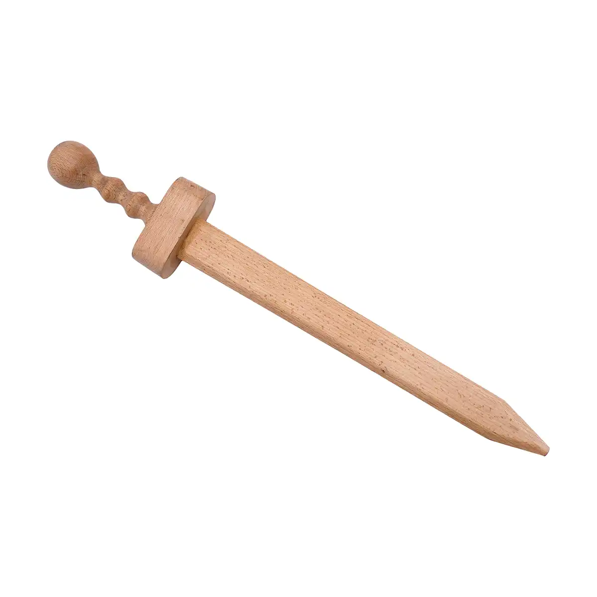 In a classic Roman style shape, this wooden sword has a broad blade with a gently tapered point, a narrow guard, and a rounded pommel that gives a secure grip. The proportions of the sword are just like the original Roman gladius, therefore it is suitable for historically inspired practice and visual authenticity.
