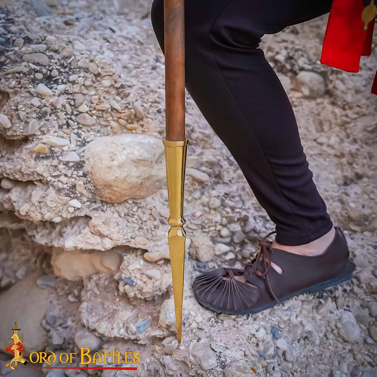 This Roman Spearhead is crafted from solid brass and polished to a rich golden finish. It has a classic conical shape with a symmetrical blade and a long, tapering point designed for deep penetration. The socketed base allows it to be mounted onto a wooden shaft like ancient times.