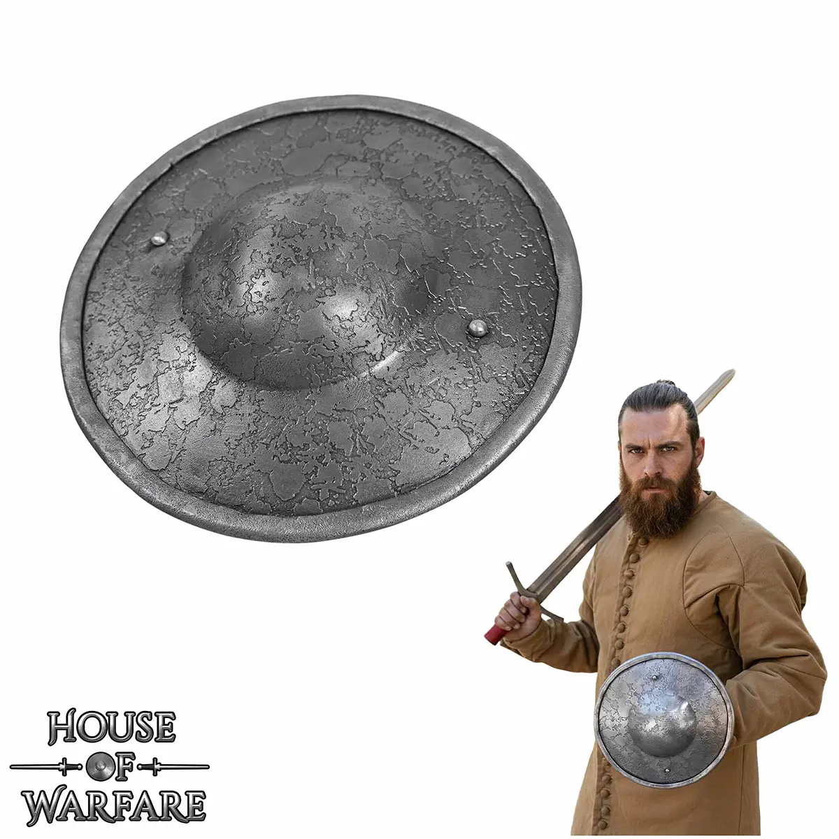 This shield buckler is hand-forged from strong 14-gauge steel and finished in natural steel for an antique hammered war worn look. It has a central domed boss for deflecting strikes away from the user’s hand, with rolled edges for additional safety, and a sturdy wooden handle which covers the steel handle and is secured with steel rivets. The wooden handle gives a comfortable grip for easy and reliable use. These features give the shield excellent balance, control, and long-term strength.