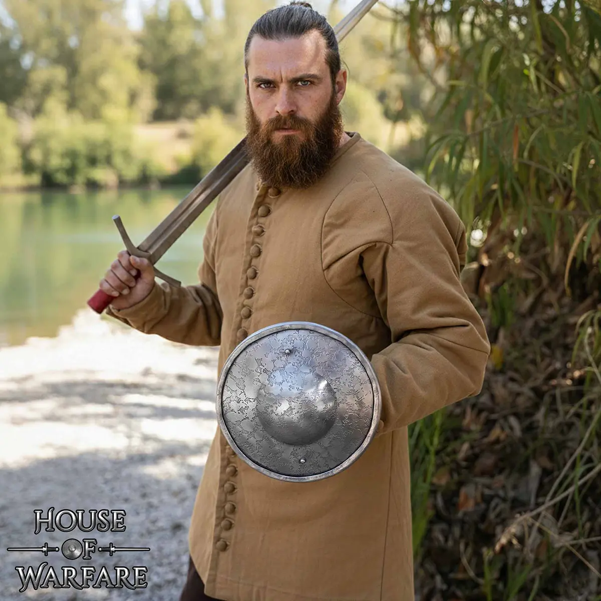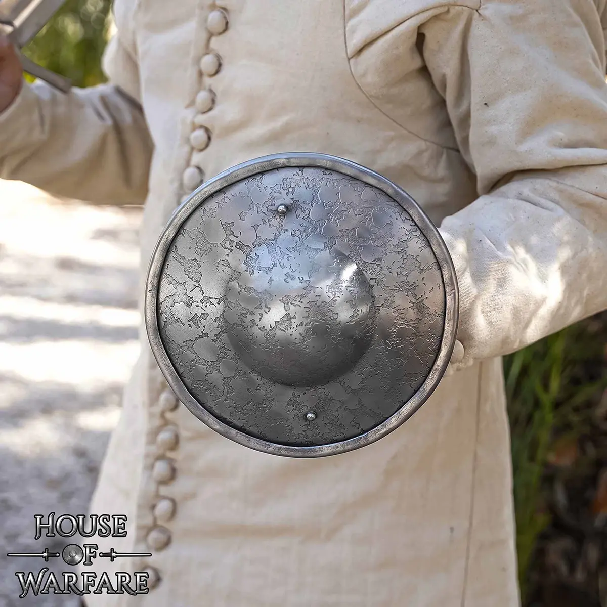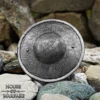 Hand-forged round buckler shield in 14-gauge steel, for LARP, HEMA training, events and display.