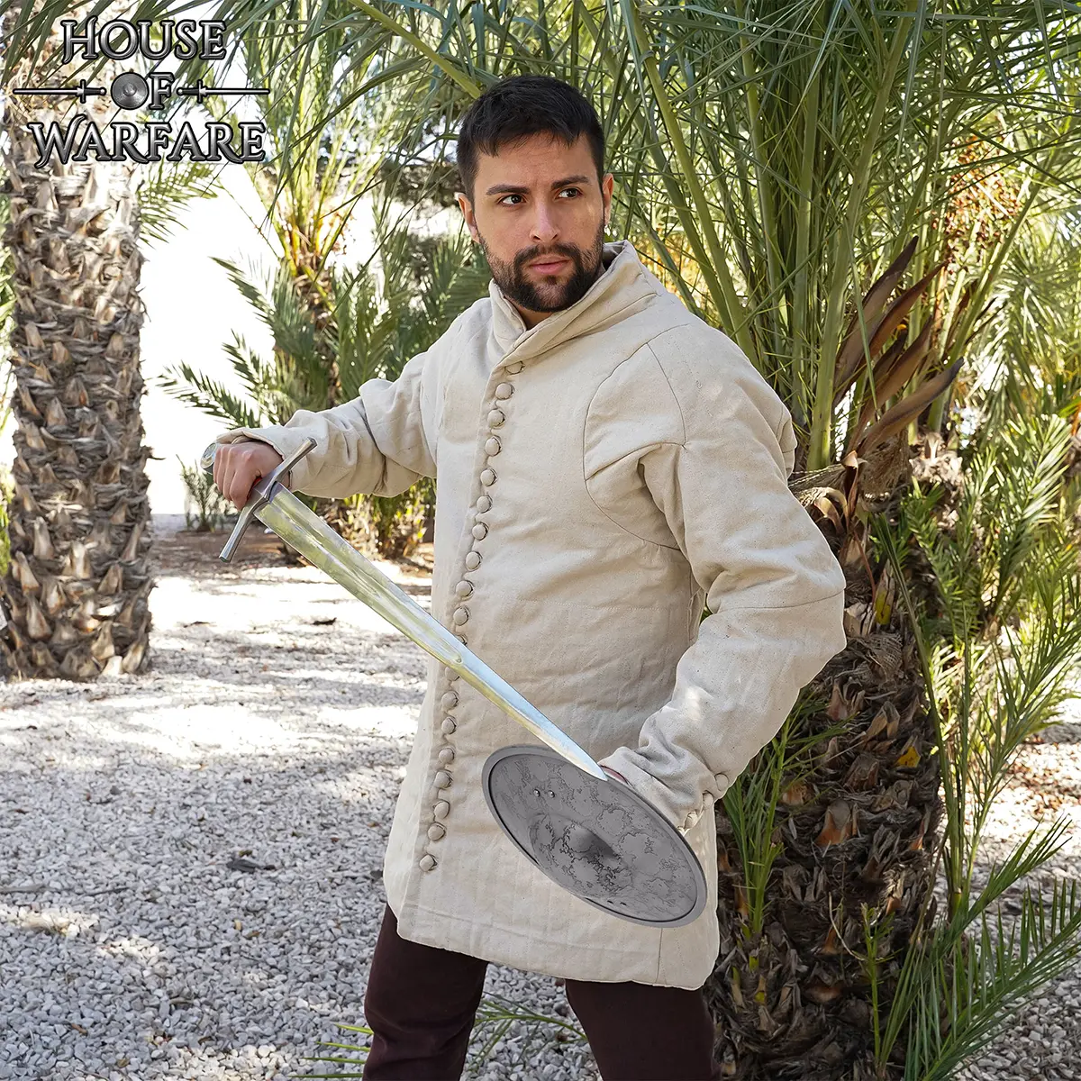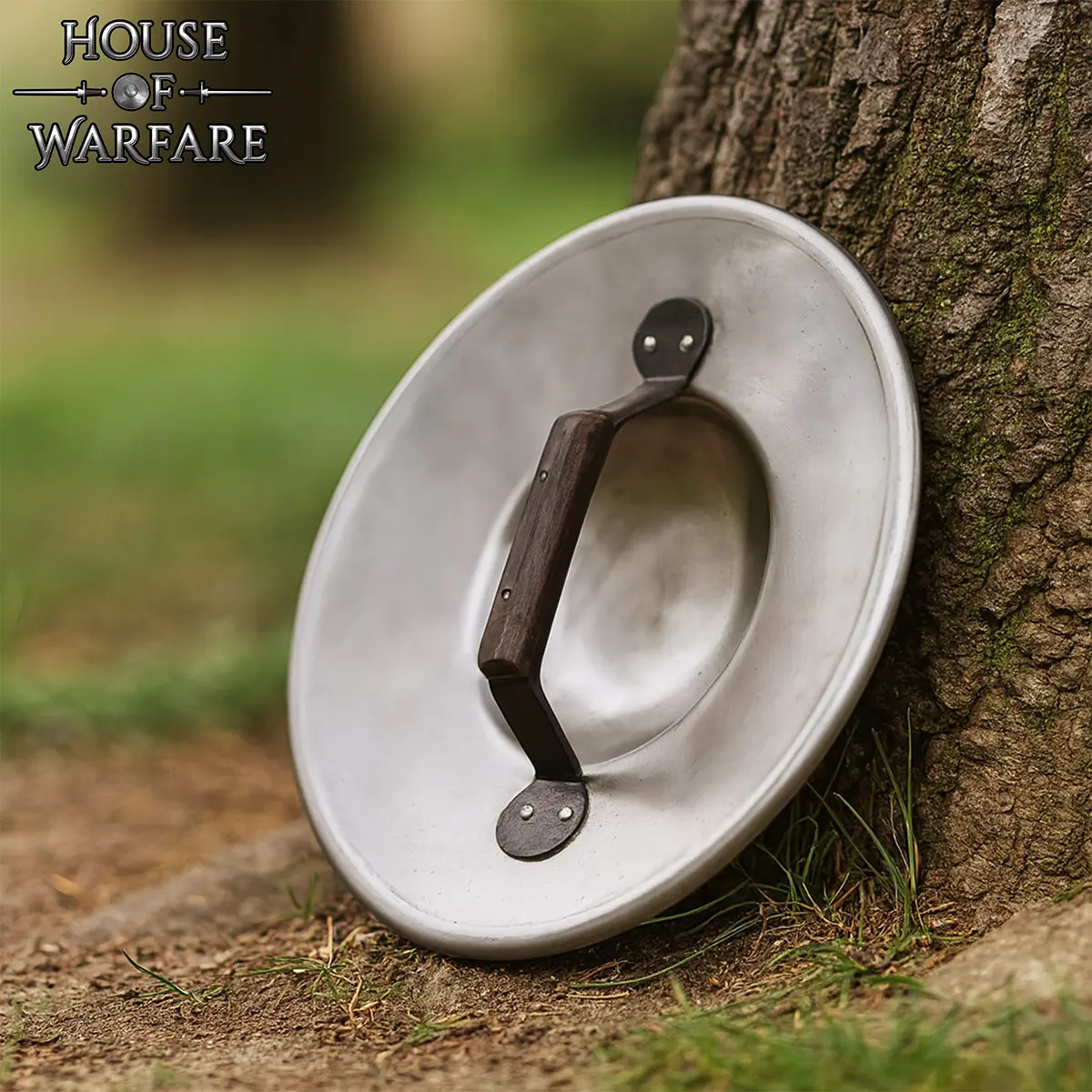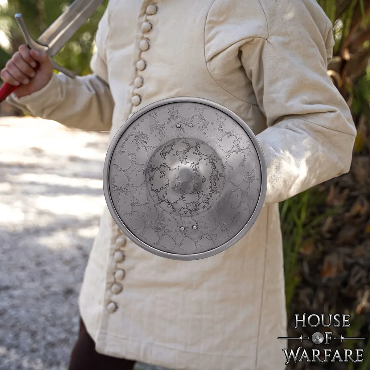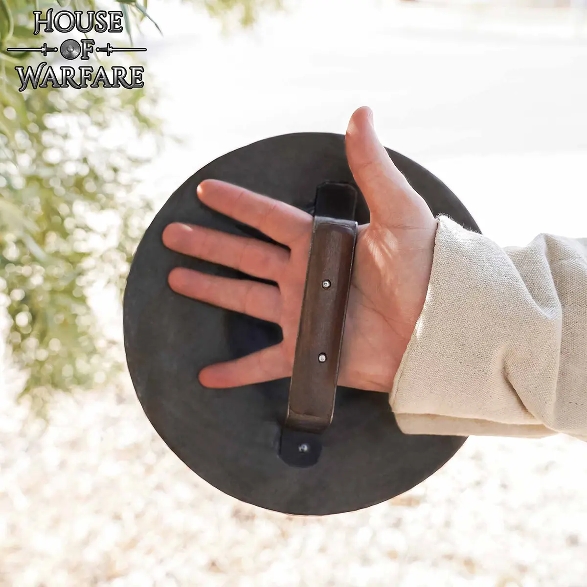 A: A round buckler shield is used for close combat defense, for deflecting blows away from the hand and protecting the hand and forearm.