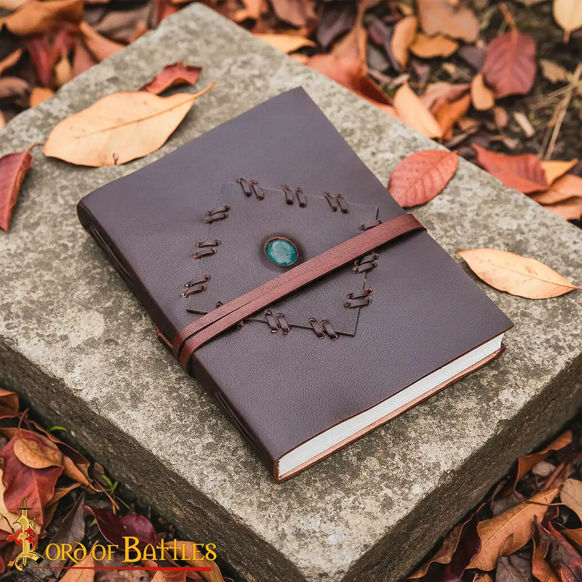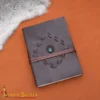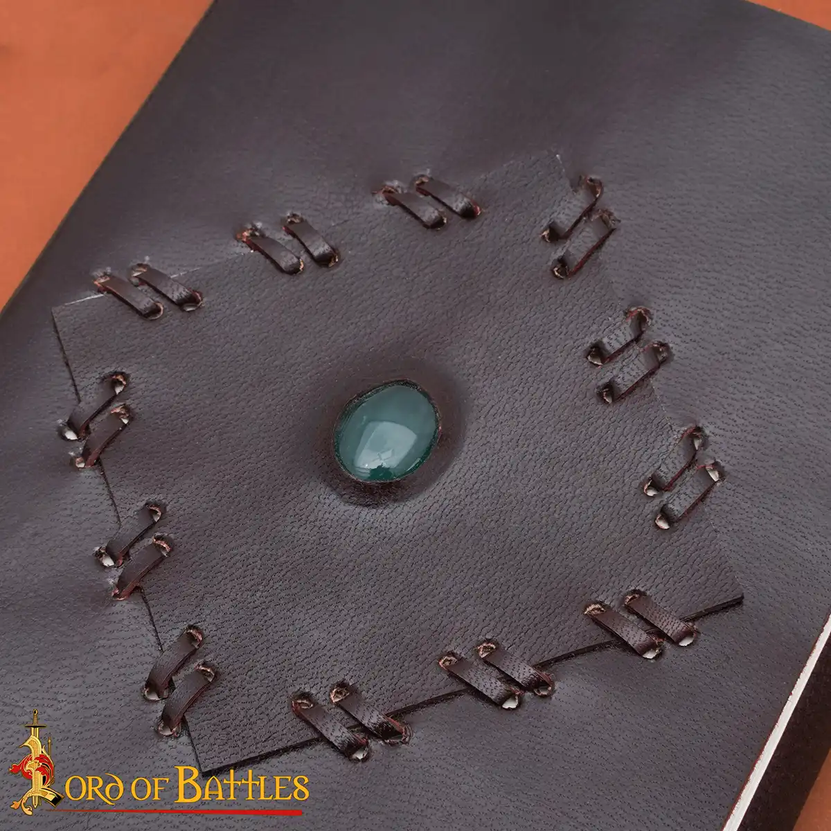 The Runestone Keeper Leather Bound Journal is a handcrafted writing companion which is inspired by medieval design and skilled craftsmanship. Made from genuine leather, this journal has a rich dark brown cover with hand stitching and a natural green stone at the center which gives it a mystical character.