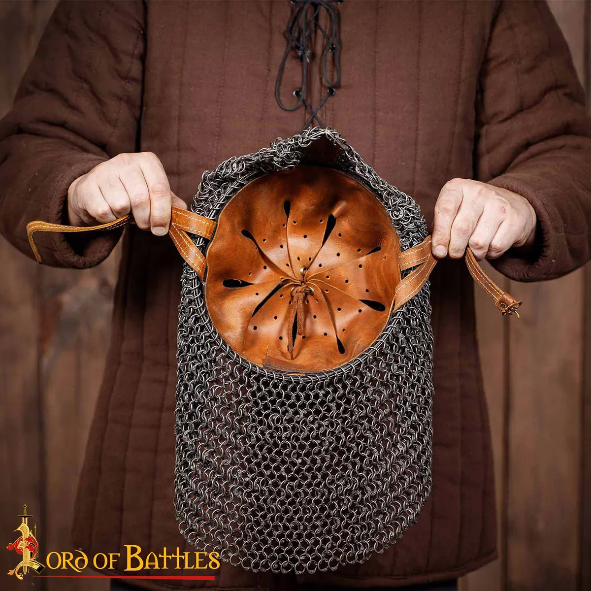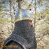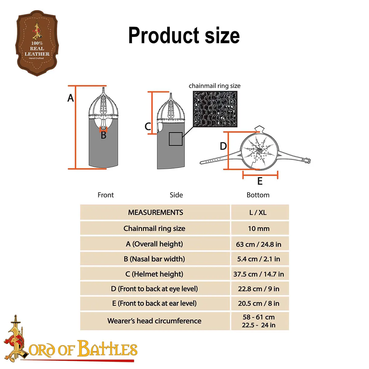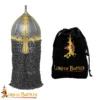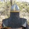 Our reproduction is HANDMADE from 16-gauge mild steel, lined with a comfortable and secure leather liner and a riveted mail aventail. An approximate circumference of 68 cm (without liner) allows it to fit almost all head sizes (65 cm with liner). A leather strap and brass buckle closure keep it secure through all battles. It has a height of about 25.5 cm with a (24.5×21) cm base. Weighs about 4 Kg 12 grams.