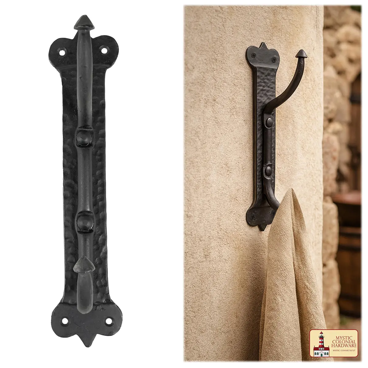 Bring both strength and elegance into your home with this hand-forged iron wall hook, featuring two sturdy hooks on a hammered backplate. Designed in a bold medieval style, it combines practical storage with a decorative gothic flair.