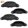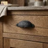 Each cup pull features a rounded silhouette with gently wavy lower edges, beautifully adorned with a raised foliage pattern that evokes the spirit of nature and old-world craftsmanship. Whether you’re restoring vintage pieces or adding character to new builds, these ornate drawer handles bring a cozy, woodland cottage or gothic revival aesthetic to your space.