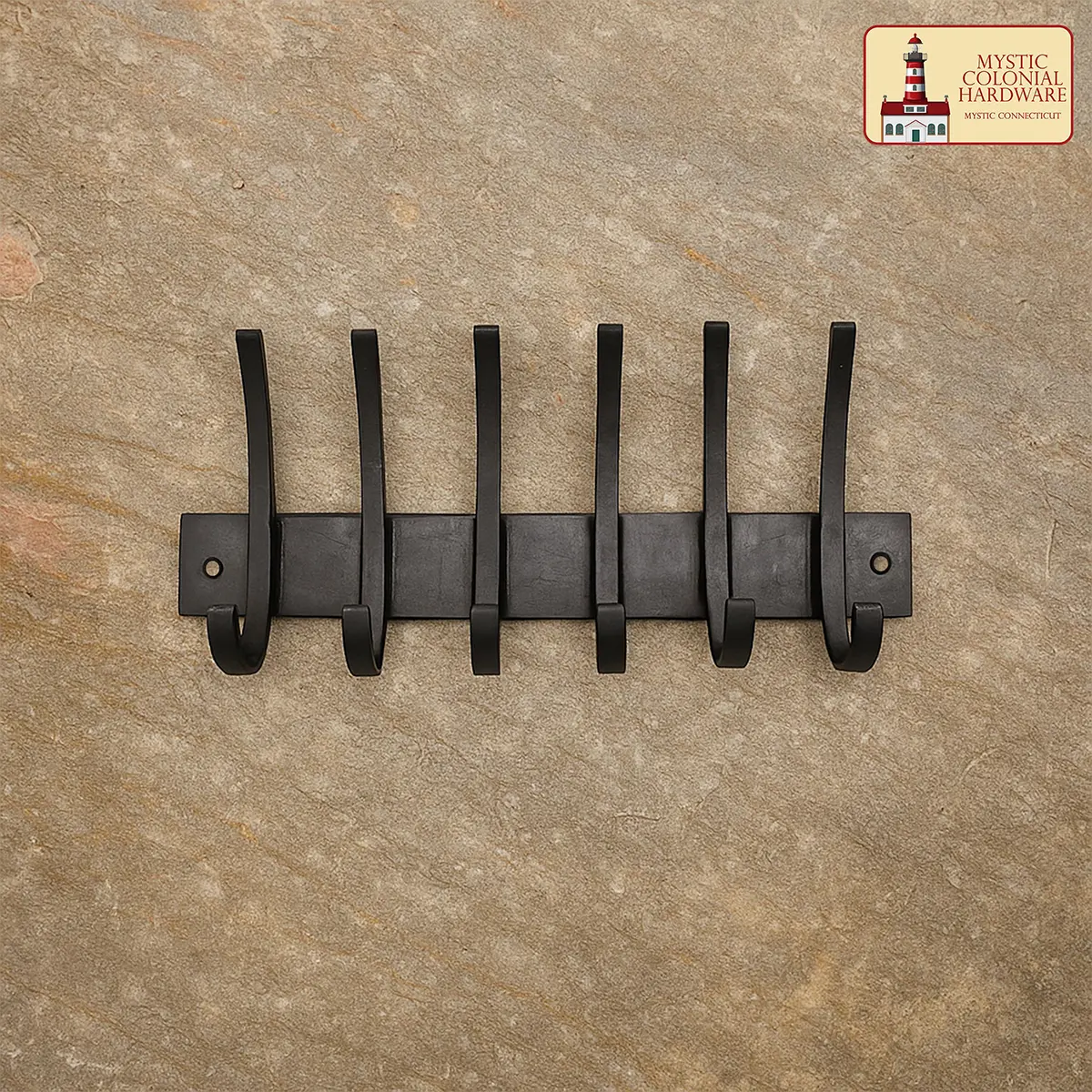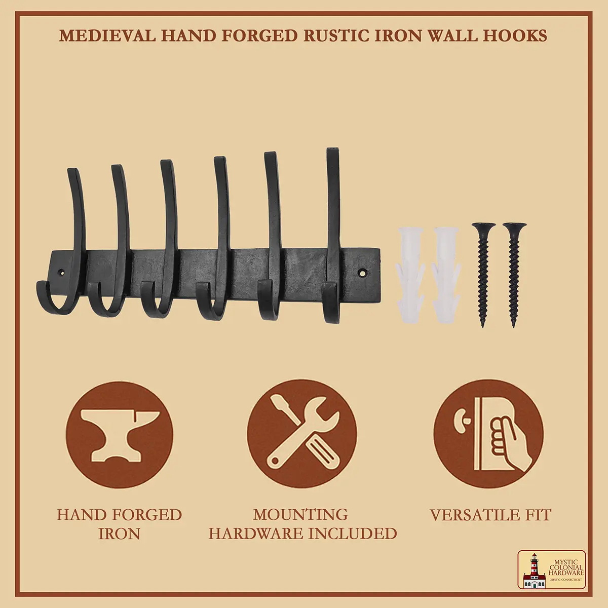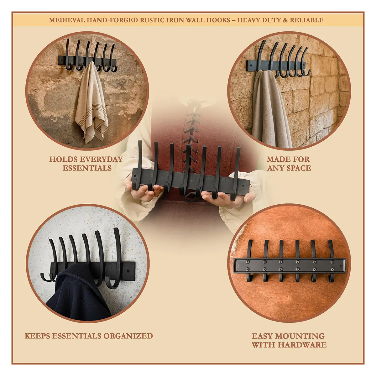 Designed with care and attention to historical authenticity, this wall-mounted rack features a rectangular backplate and six evenly spaced J-shaped hooks, each with a rounded tip for secure hanging. The hand-forged construction and oil-blackened finish lend the piece a weathered, aged look that fits seamlessly into medieval cottages, vintage farmhouse spaces, and eclectic modern homes alike.