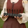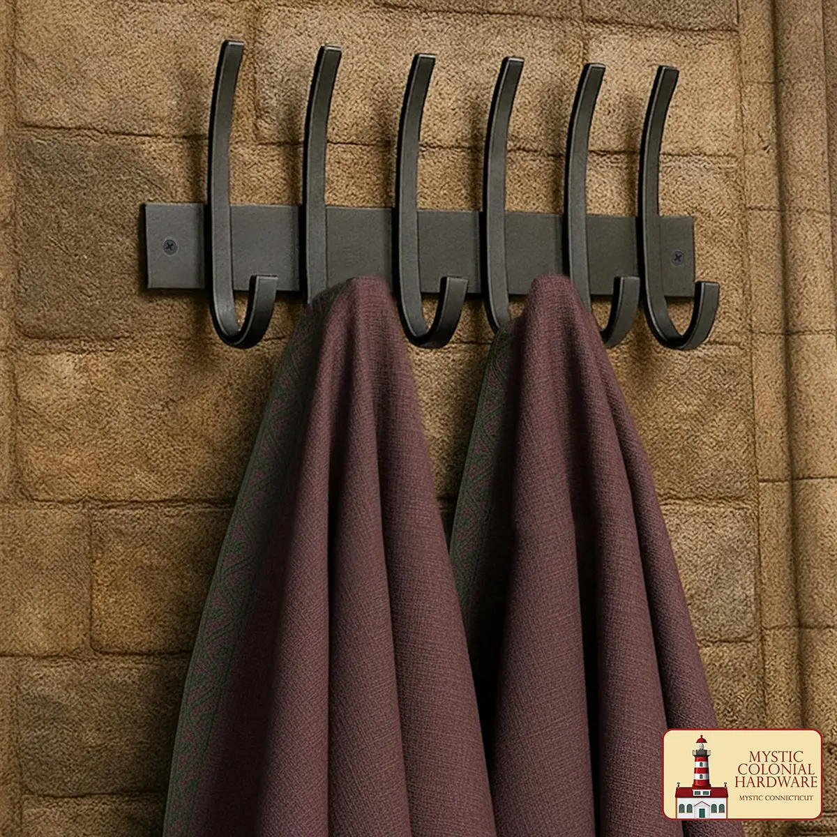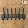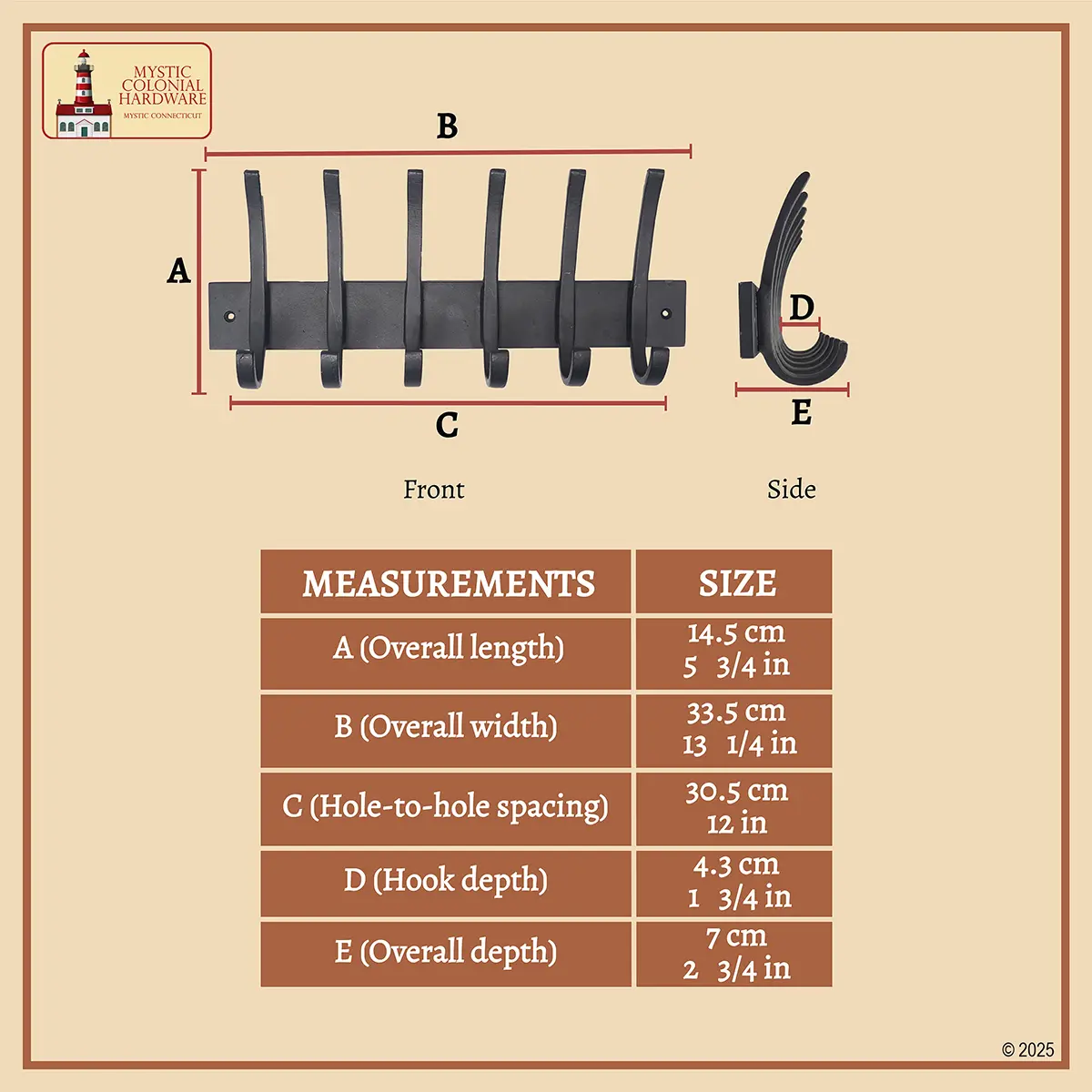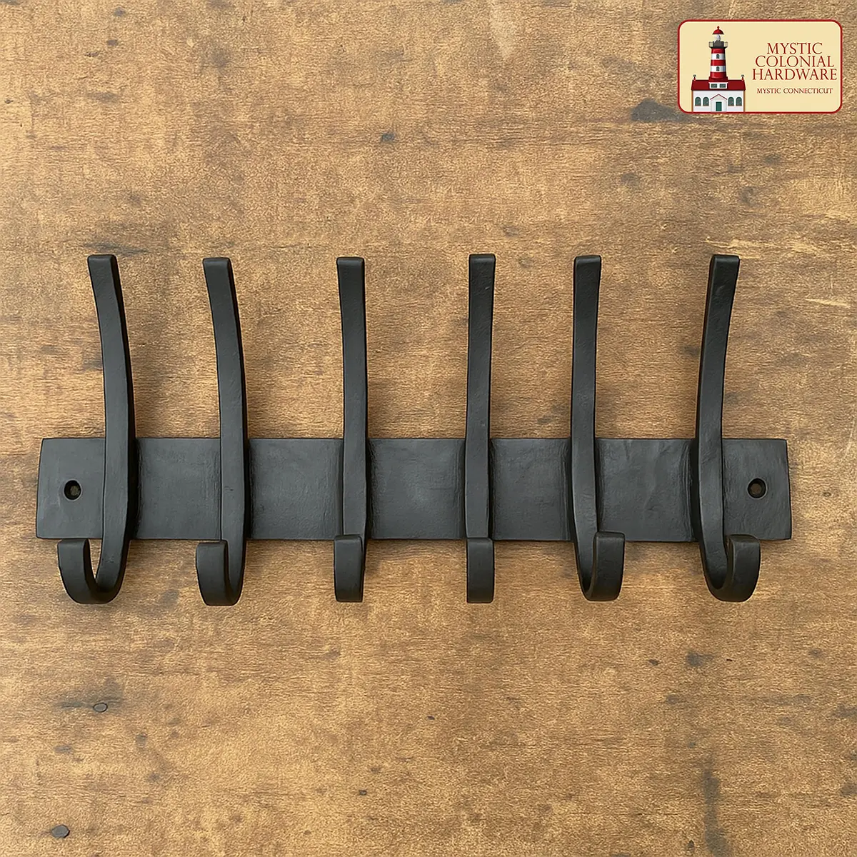 Designed with care and attention to historical authenticity, this wall-mounted rack features a rectangular backplate and six evenly spaced J-shaped hooks, each with a rounded tip for secure hanging. The hand-forged construction and oil-blackened finish lend the piece a weathered, aged look that fits seamlessly into medieval cottages, vintage farmhouse spaces, and eclectic modern homes alike.