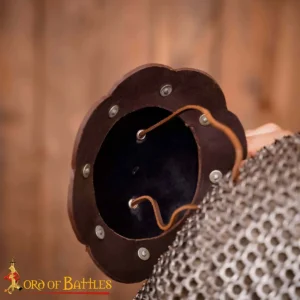 What sets these spaulders apart is the use of thick, genuine leather edging, which enhances their aesthetic appeal while serving a critical functional role. Each leather edge is stoutly riveted to the rondell plate, ensuring durability and longevity even in the most demanding environments. When you slide these onto your shoulders, you’ll notice how they anchor securely onto your arming garment, gambeson, or even a chainmail shirt. Say goodbye to the uncertainty of poor-fitting armor; these come with two leather cords for easy lacing, making them incredibly user-friendly. Whether you’re engaging in a lively reenactment or simply displaying them as part of your collection, our spaulders provide peace of mind, allowing you to focus on your passion without distraction. With a total diameter of approximately 21 cm, they are designed to fit most, offering flexible use across various body types.