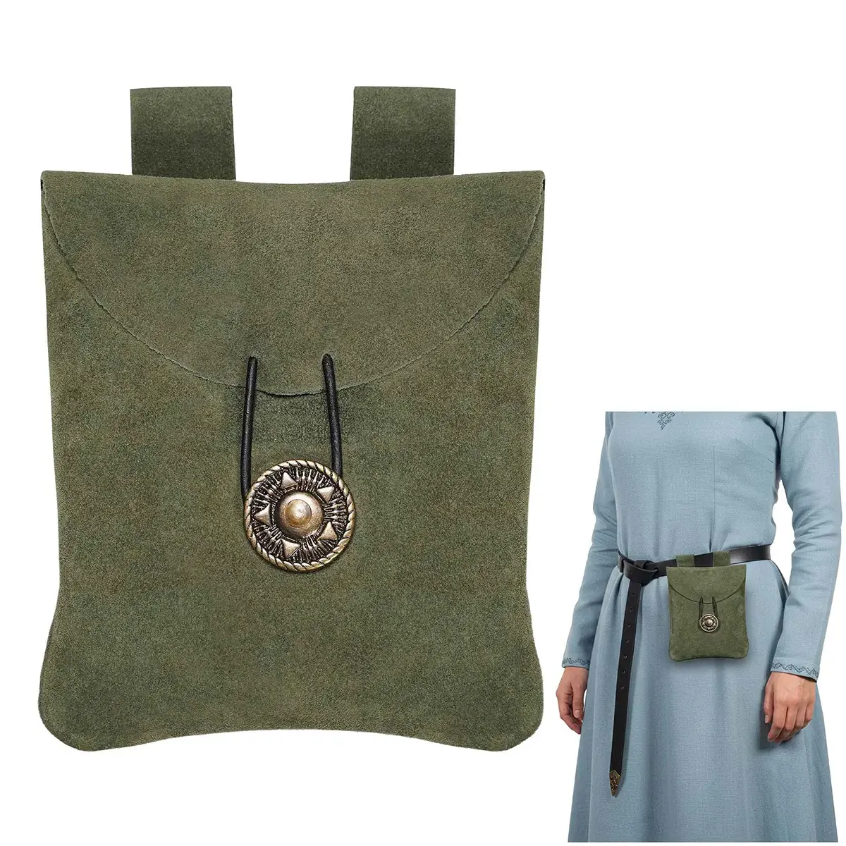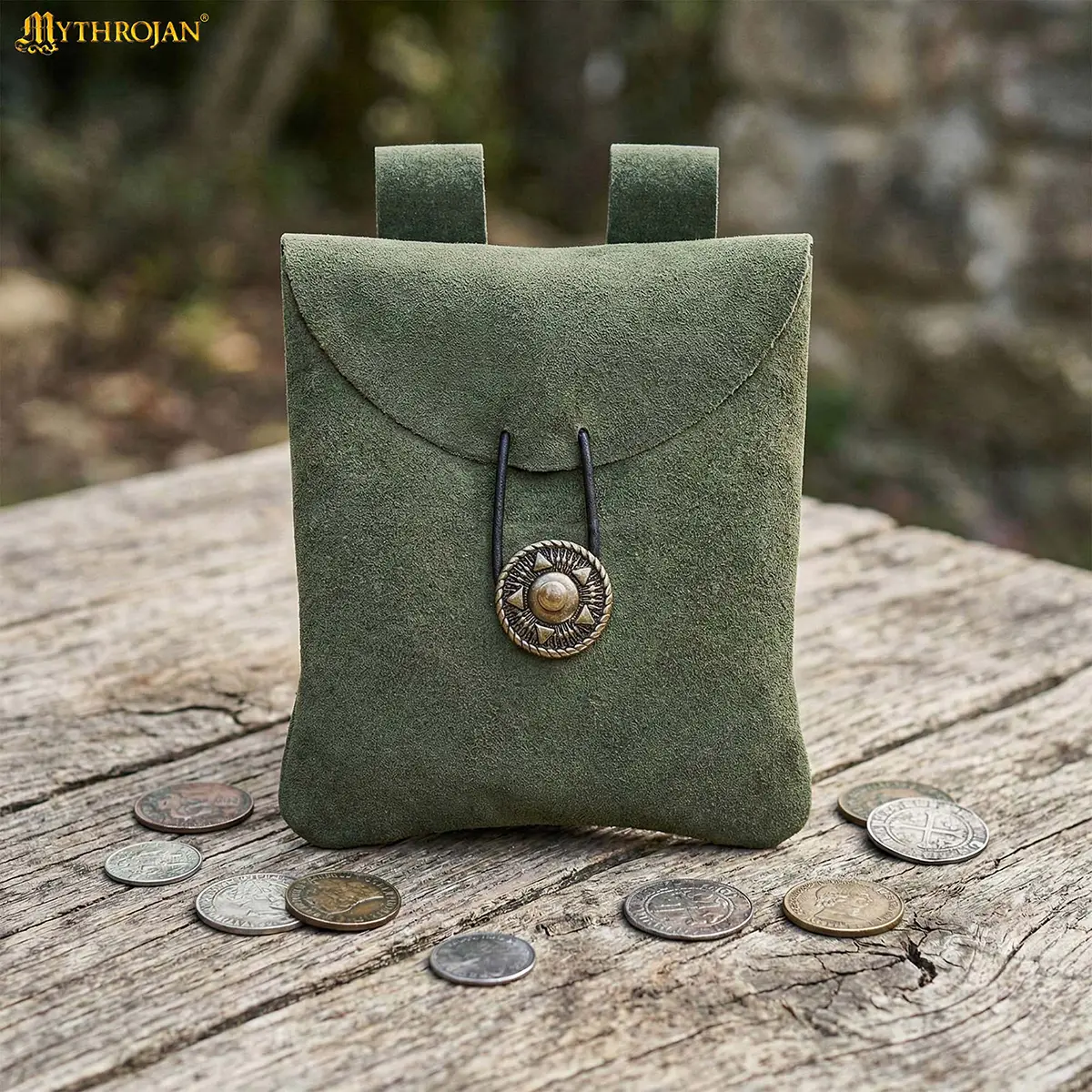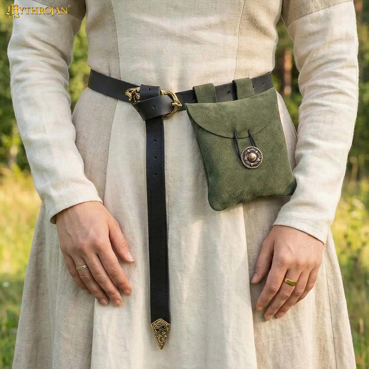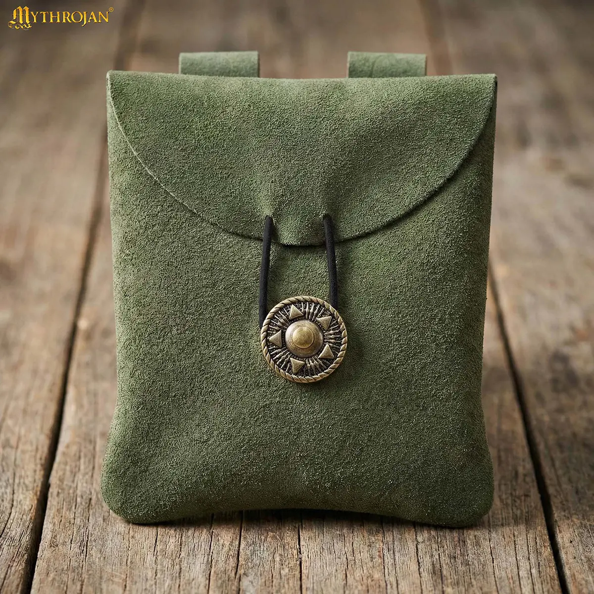 The pouch has a classic flap secured with a decorative button and leather loop closure, keeping your essentials safe while staying true to period aesthetics. With its space, this suede belt pouch is ideal for storing coins, keys, dice, cards, or other personal belongings. The belt loops at the back ensure it hangs securely from your belt, accommodating widths of up to 6.5 cm (2.5 in).