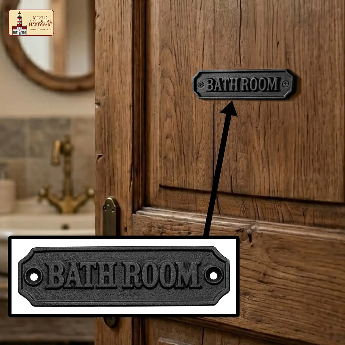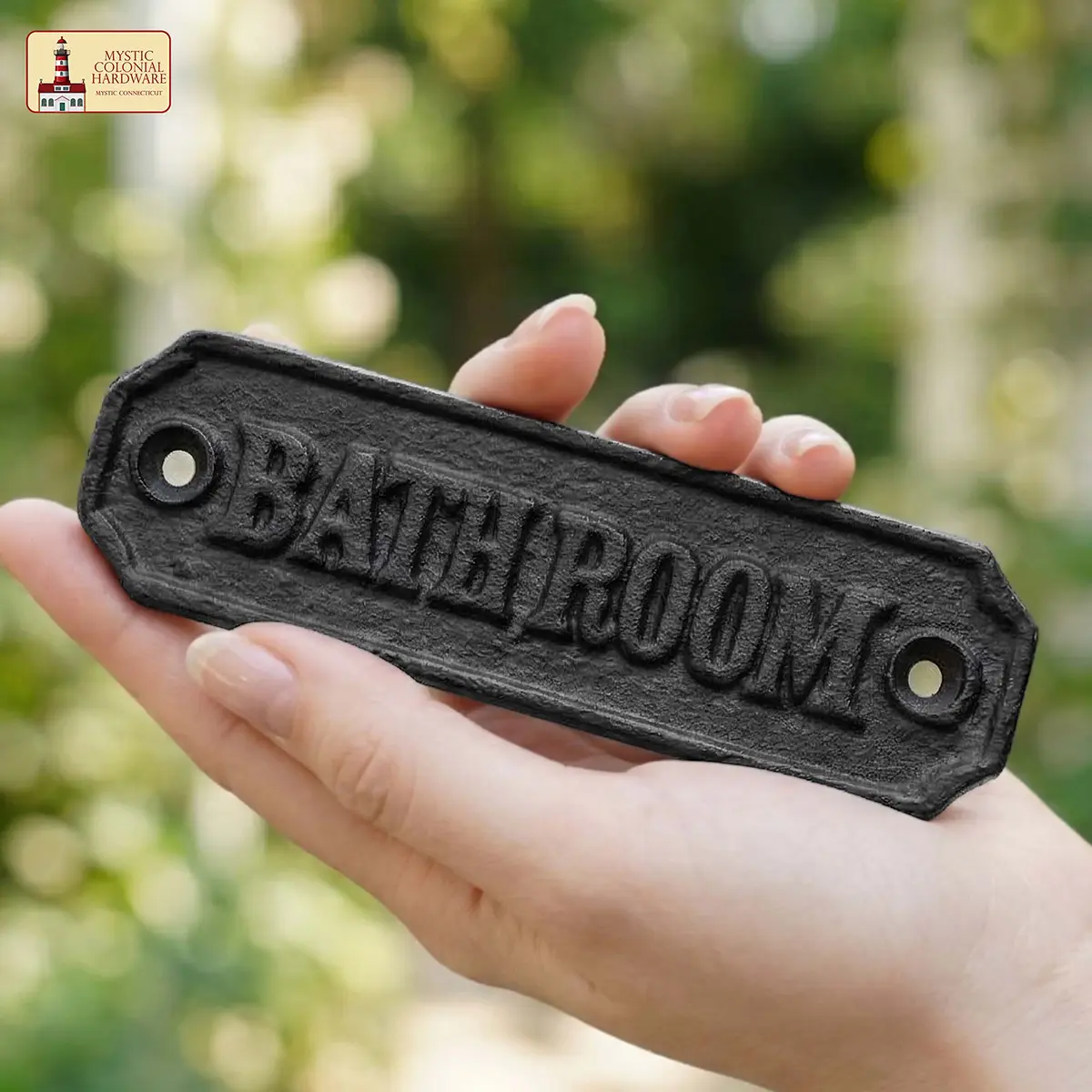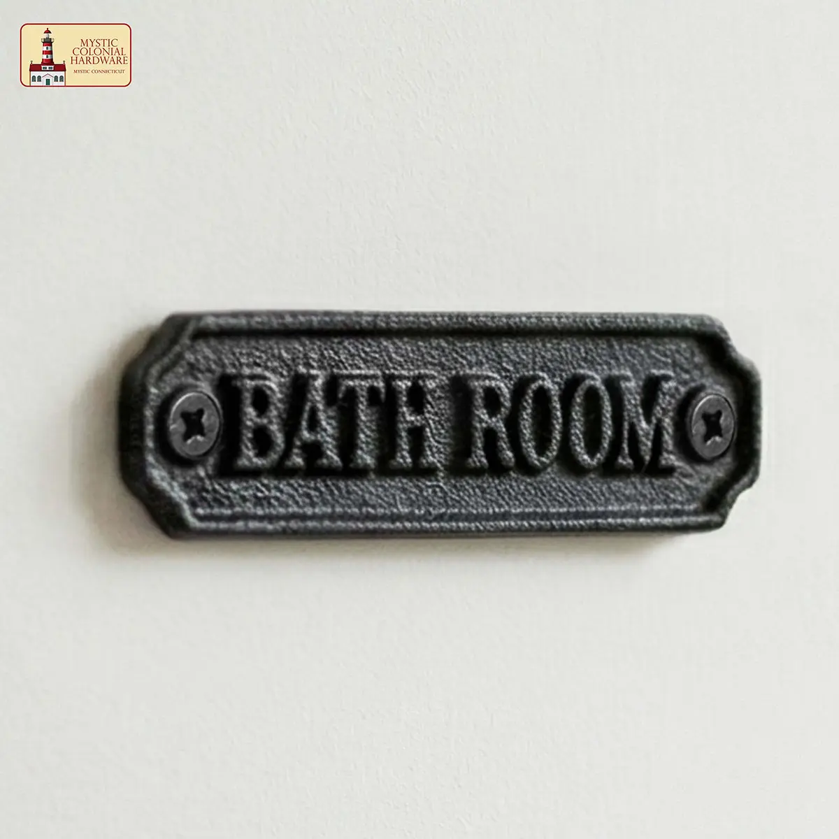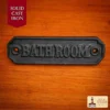 Expertly crafted from solid cast iron, this bathroom door plaque showcases raised serif lettering that clearly and elegantly reads “Bathroom.” The dark, oil-blackened finish enhances its classic appeal, making it ideal for homes ranging from traditional and farmhouse to modern or steampunk-inspired interiors.