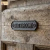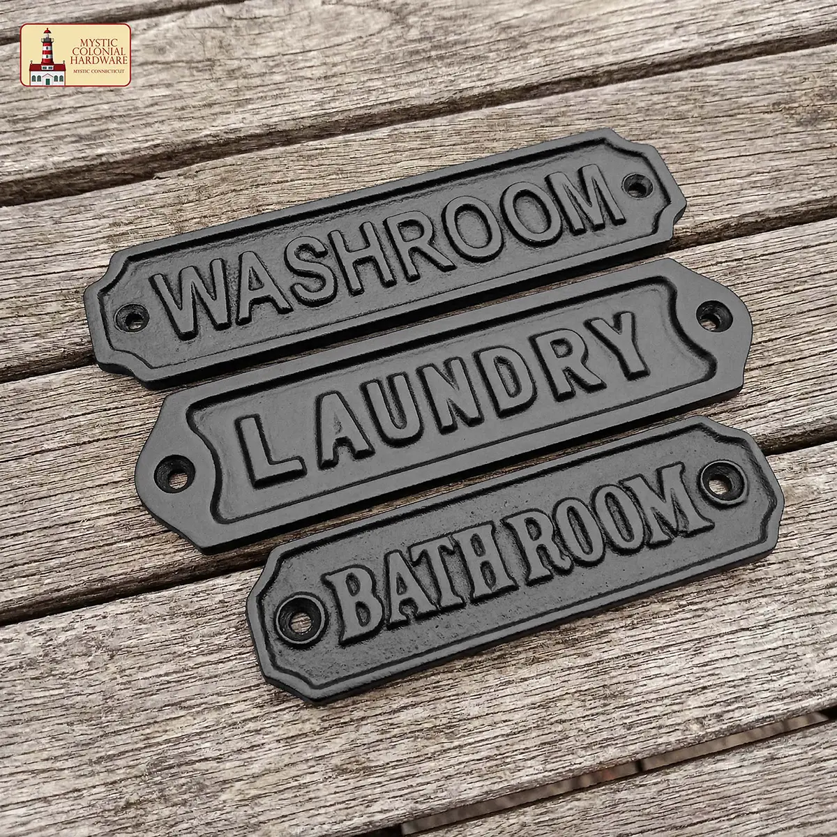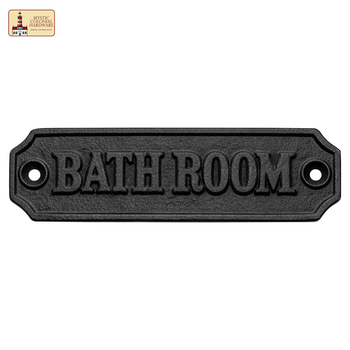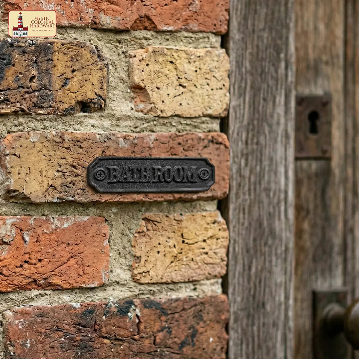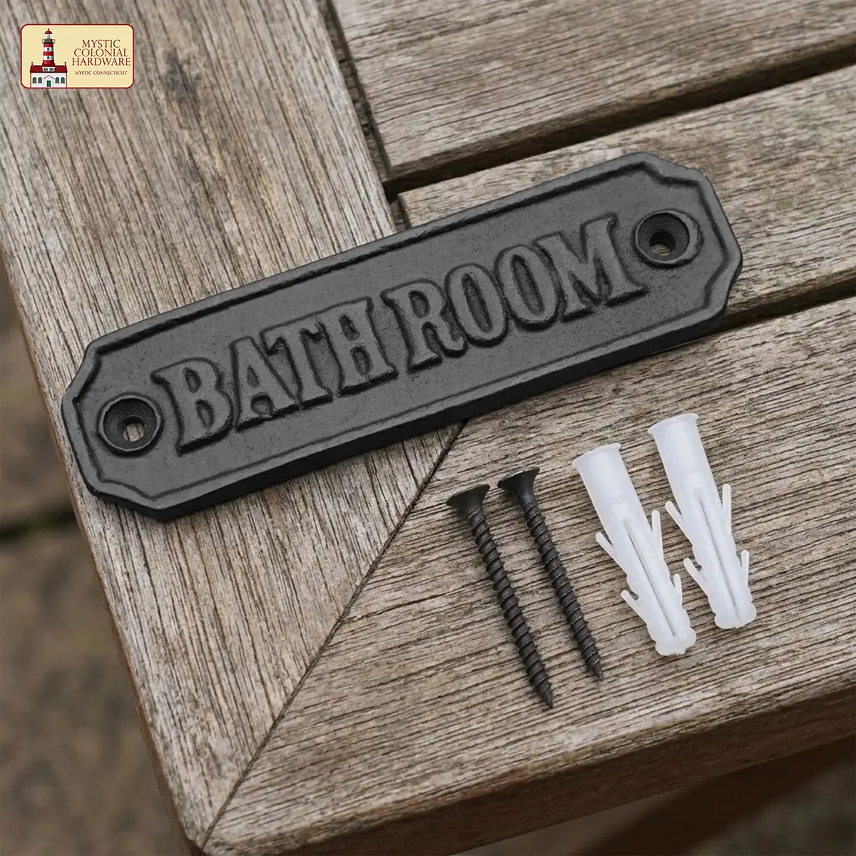 Expertly crafted from solid cast iron, this bathroom door plaque showcases raised serif lettering that clearly and elegantly reads “Bathroom.” The dark, oil-blackened finish enhances its classic appeal, making it ideal for homes ranging from traditional and farmhouse to modern or steampunk-inspired interiors.