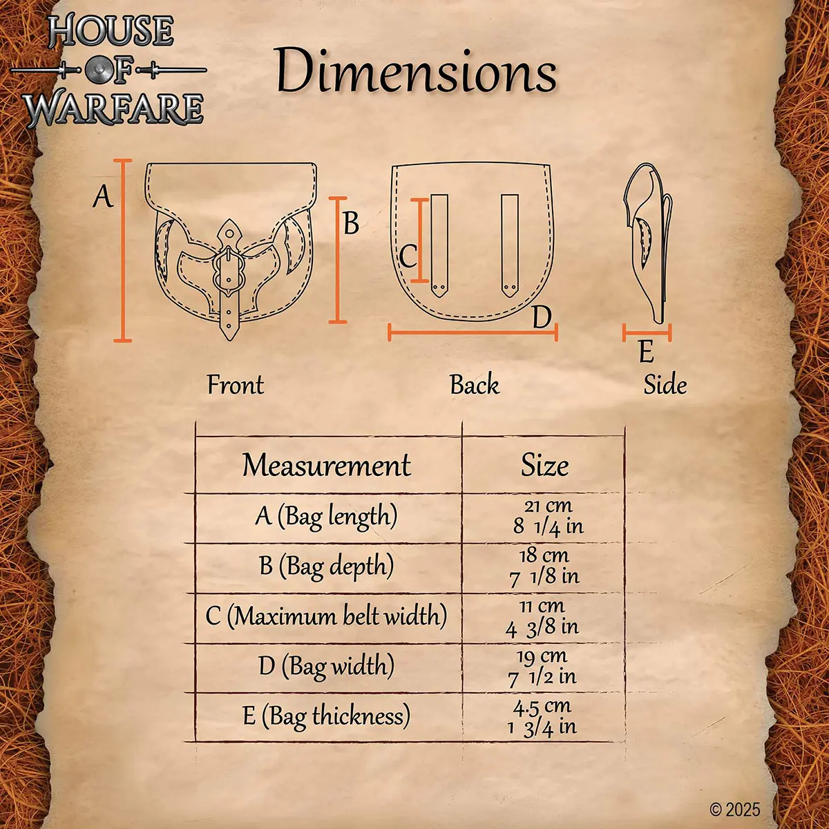 Designed for practicality, the back has extra-wide belt loops that fit belts up to 11 cm (4½ in) wide, making it compatible with thick medieval or fantasy belts. Perfect for holding coins, scrolls, flint, tokens, or tools.