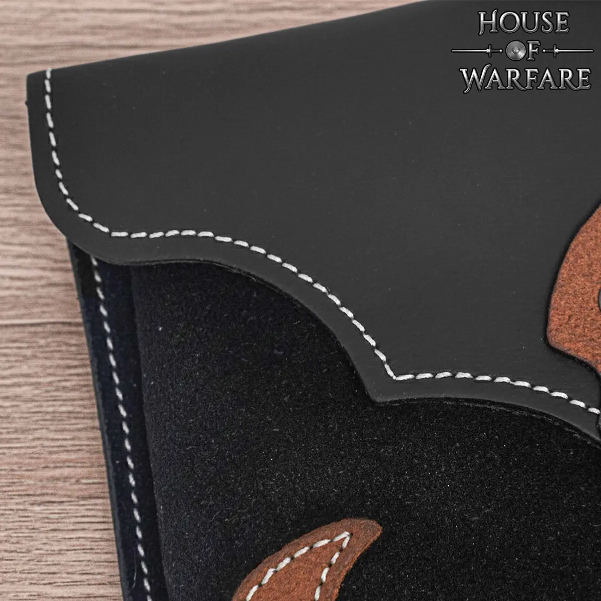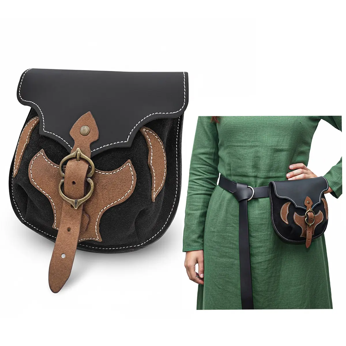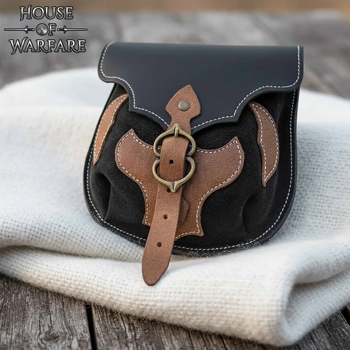 Its black leather body is complemented by a rich brown appliqué, hand-stitched in an elegant curved pattern that shows late-medieval and Gothic design traditions. A long leather strap with a solid brass buckle is present for a reliable closure, keeping your belongings safe whether you’re roaming the fairgrounds or setting out for a LARP adventure.
