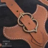 A: It has a leather strap with a solid brass buckle for secure closure.