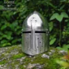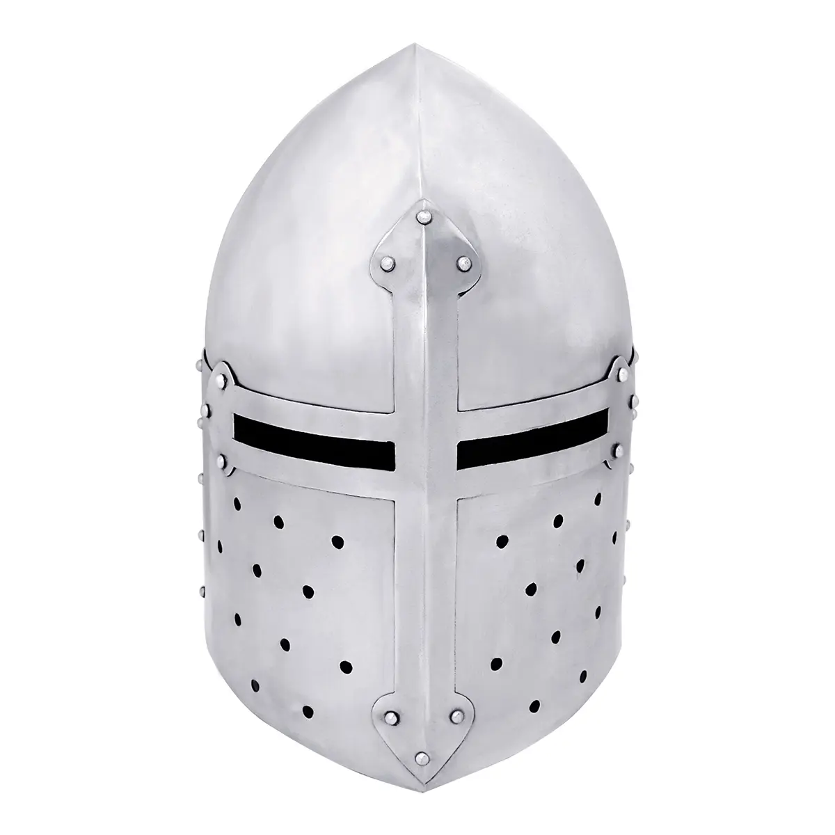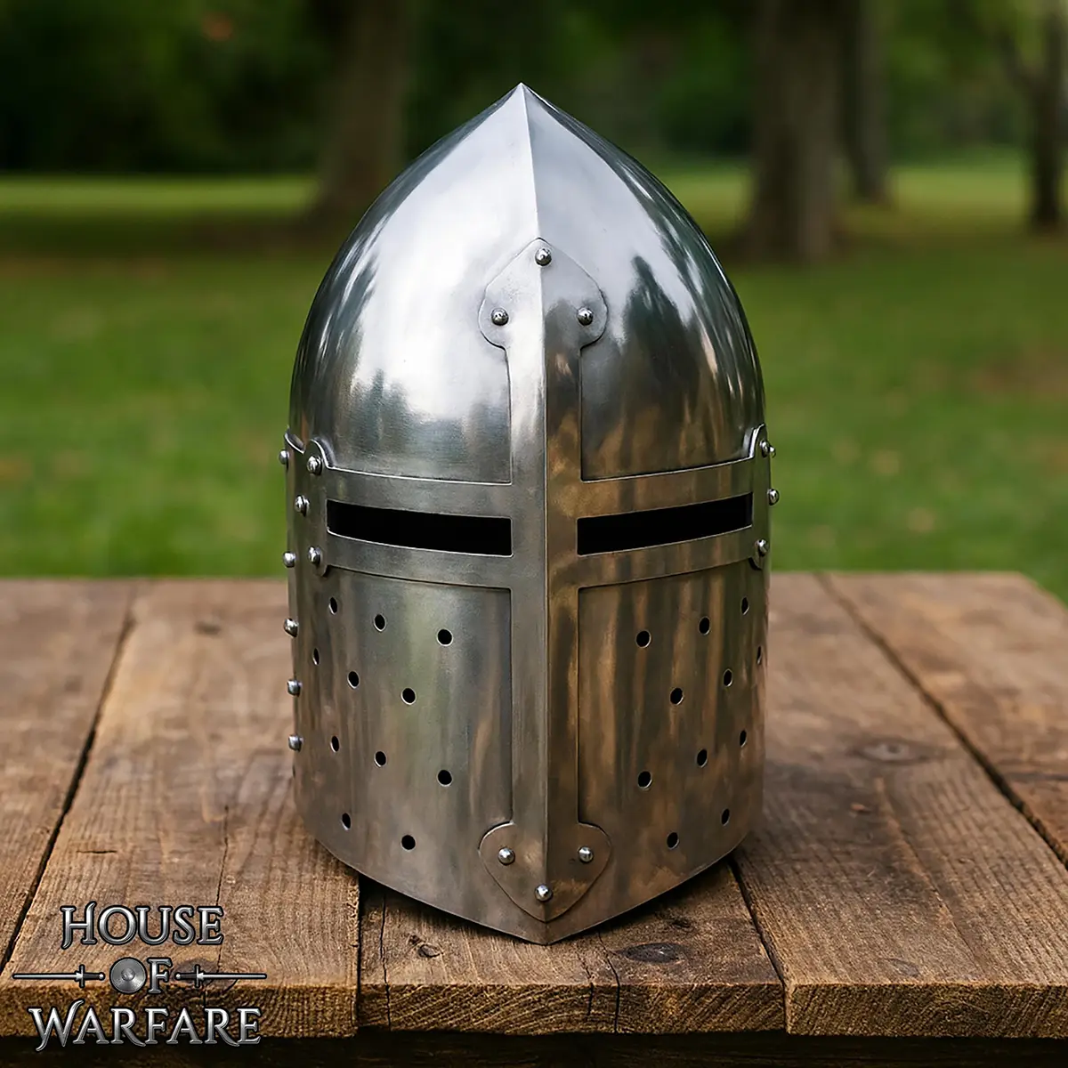 Historically, the Sugar Loaf Helmet evolved from the Great Helm and gained popularity during the 13th and 14th centuries, particularly among knights of Western Europe. Its conical top, like that of a sugar loaf was designed to deflect downward blows efficiently.