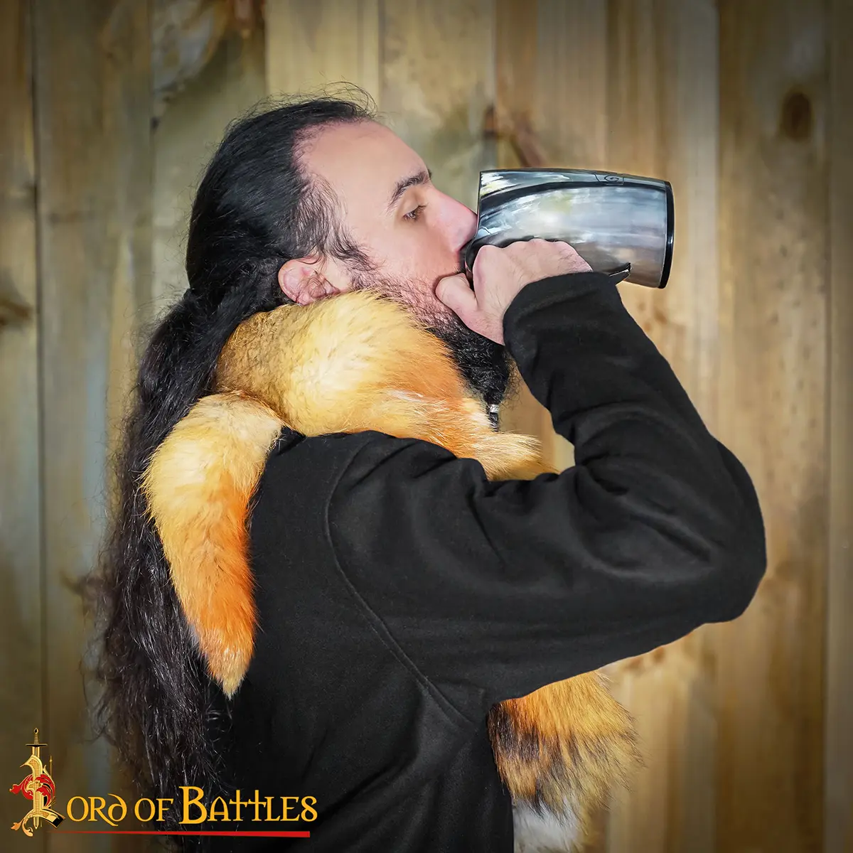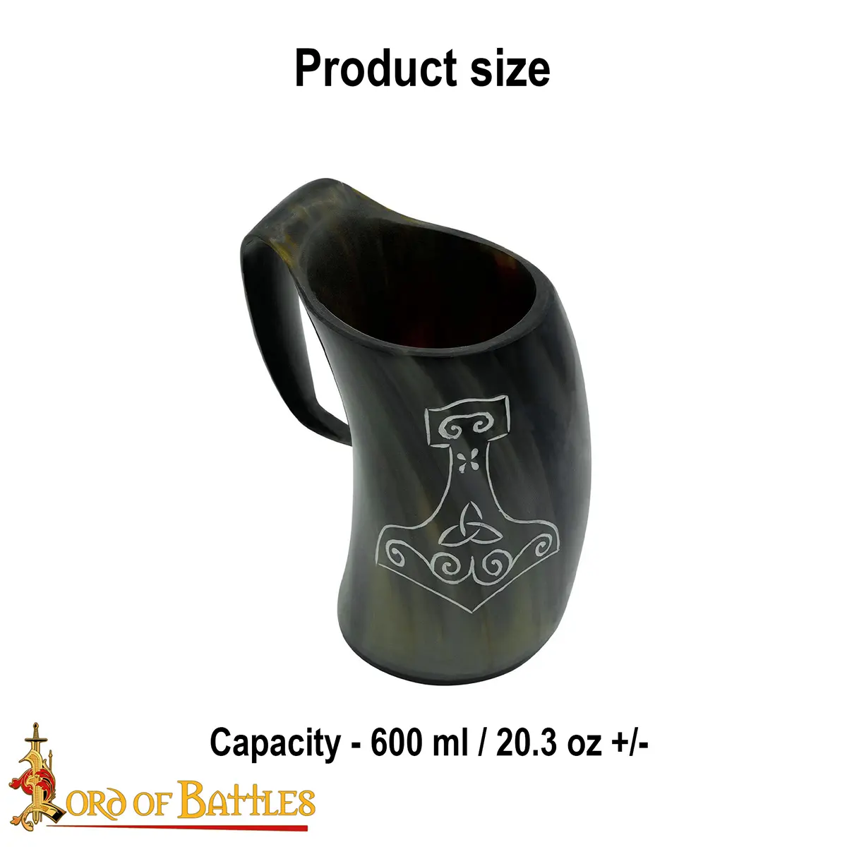 This ceremonial drinking horn tankard has been made to fit approx. 600 ml of your ale. It is 0% leak locked and is suitable for cool liquids that have up to 20% alcohol content. Please avoid using dishwasher and hot liquids; before use, make sure to wash under running water. For a longer life span treat with bees’ wax after each use. Please note this is a natural product that decays with time and hence, cracks may come.