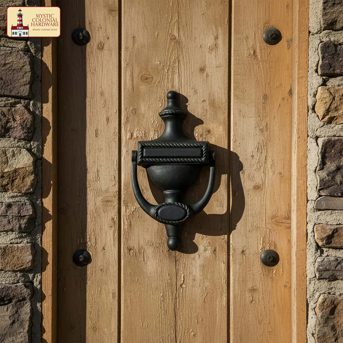 Inspired by classical and Georgian styles, this door knocker features a shallow urn silhouette with graceful curves and a sense of refined structure. At its center sits a rectangle with a rope-like border, offering a subtle decorative accent. Below it, the knocker transitions into a rounded bowl and finishes with a charming finial, capturing the essence of traditional ironwork.
