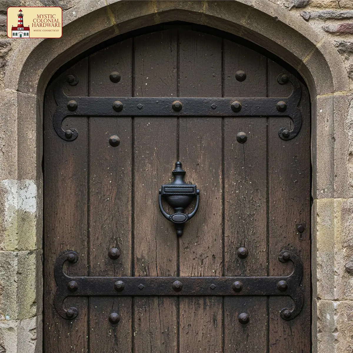 The rounded knocker arm includes an oval grip at the base, making it easy to grasp and use. Together, these design elements evoke the grandeur of medieval cottages, Gothic manors, or stately Renaissance homes, blending seamlessly with rustic or historically styled architecture.