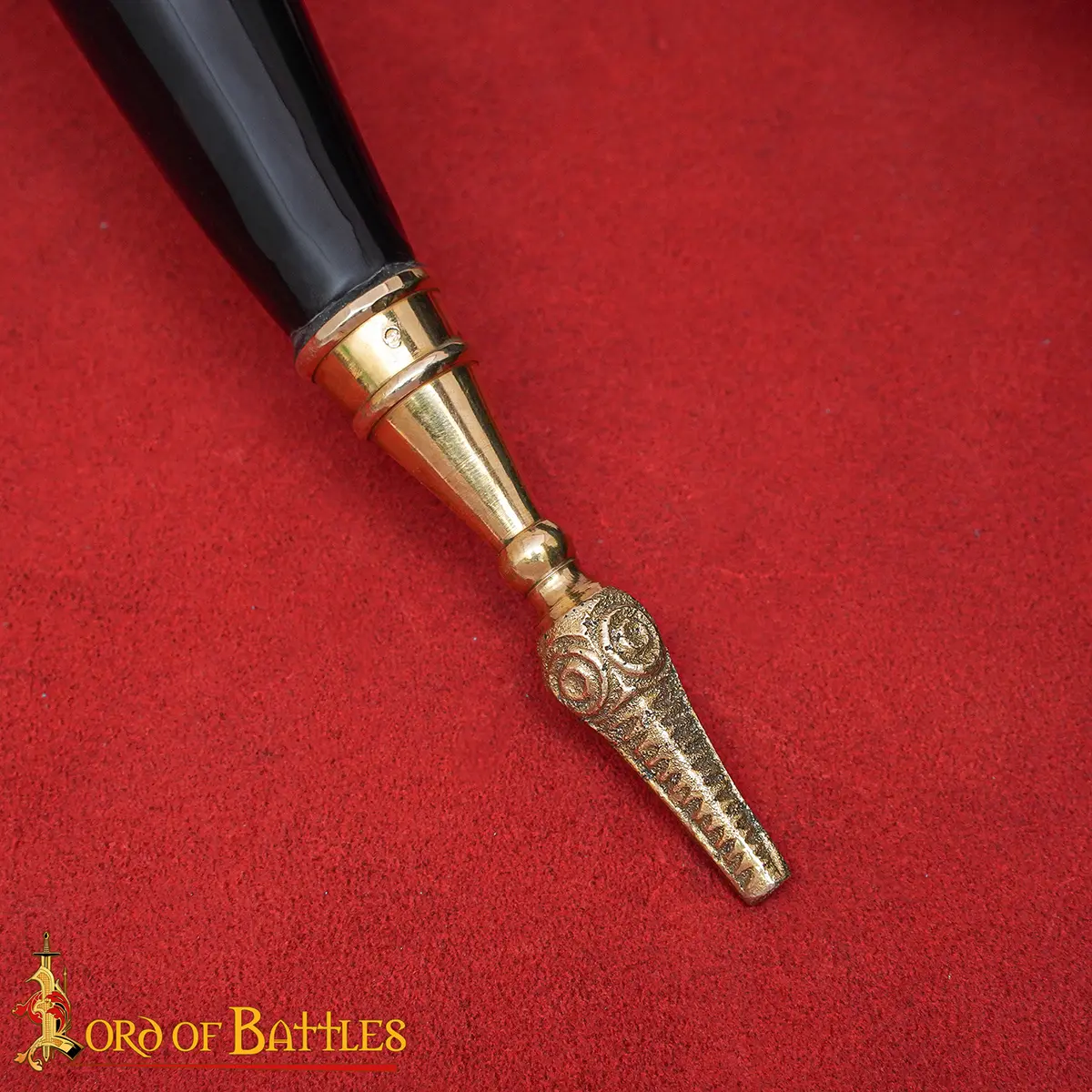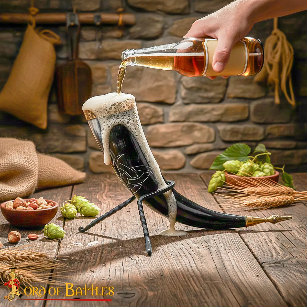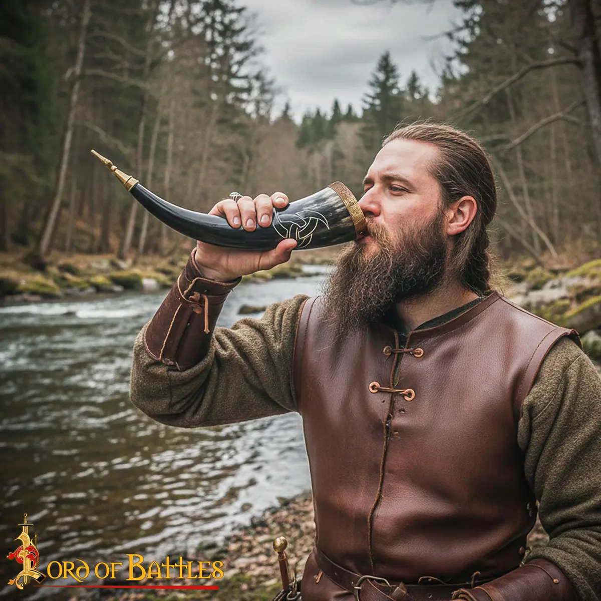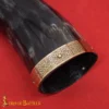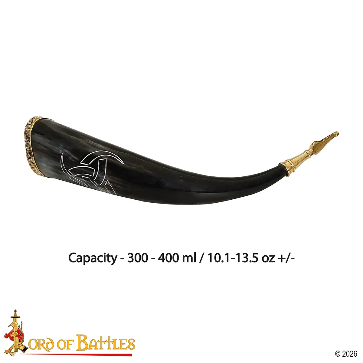 Be it glugging ales with your friends or simply adorning your décor, our drinking horn with engraved mighty Triple Horns of Odin, is just the right fit. It is well embellished with pure solid brass fittings that make it visually appealing and a perfect gift for your loved ones! Since it comes with a sturdy canvas bag, it can effortlessly be taken care of for years to come!
