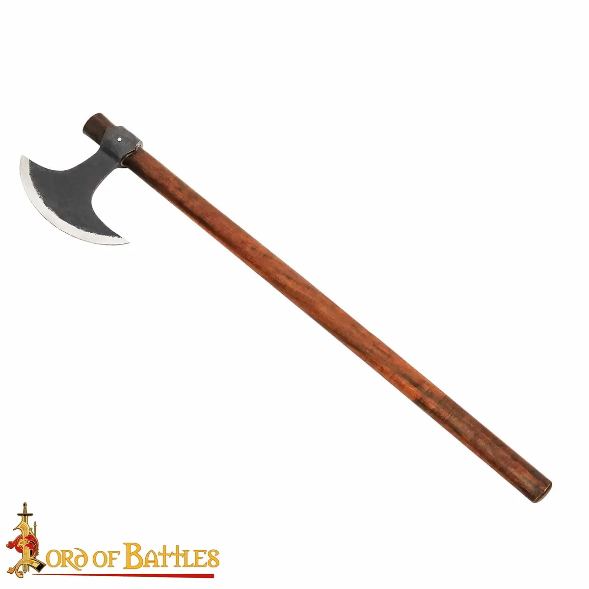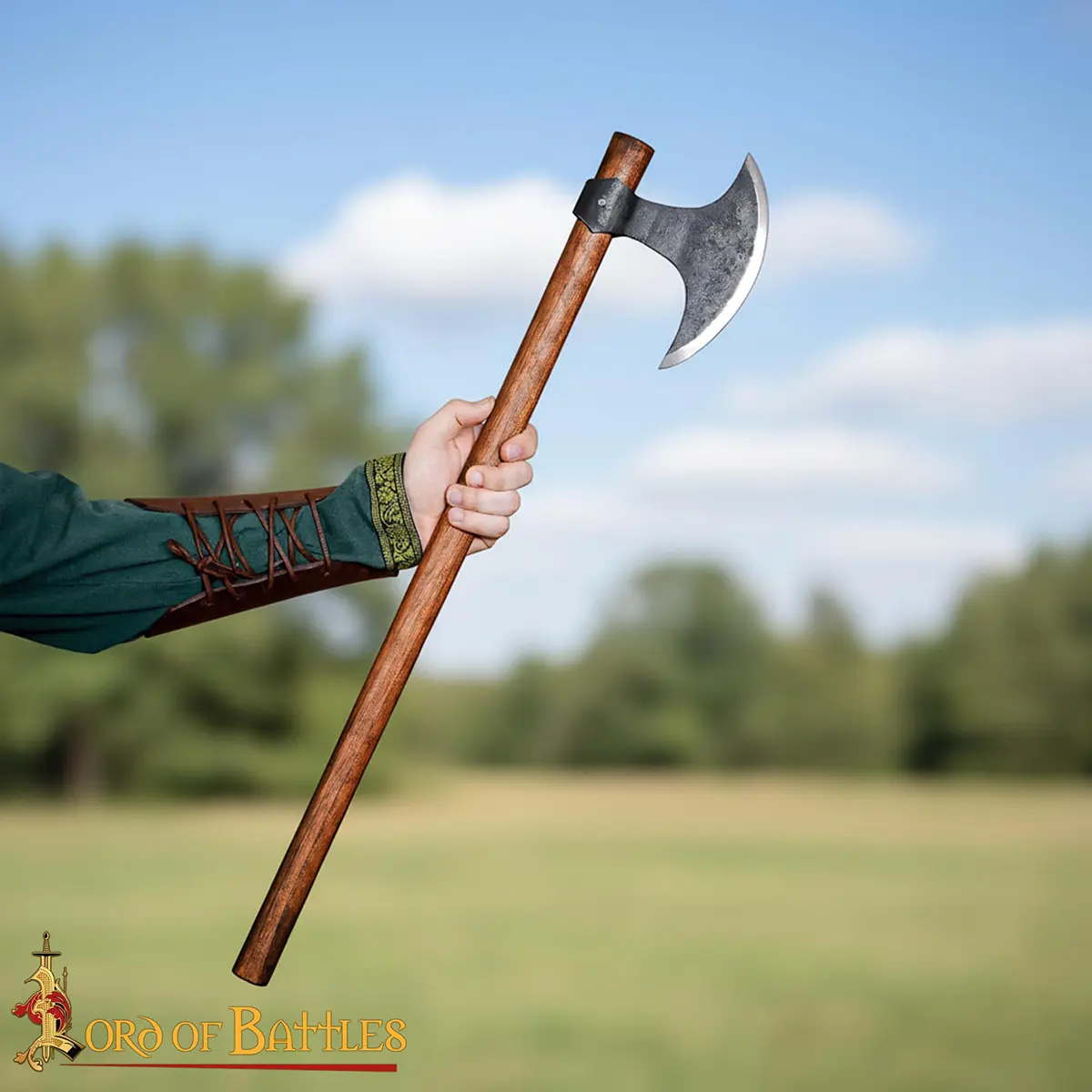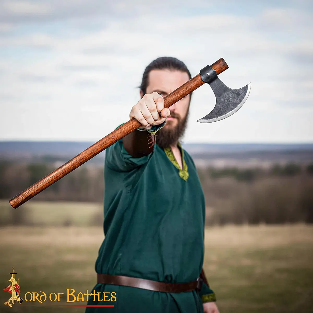 The head of this Viking battle axe is made from carbon steel and is fitted properly for controlled strikes. The edge is supplied blunt for safety reasons, it can be sharpened if needed depending on its use. This makes it suitable for outdoor work, chopping tasks, Viking themed events or as a historically inspired tool.