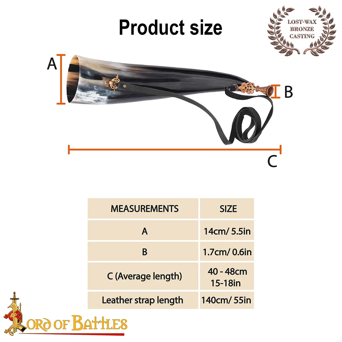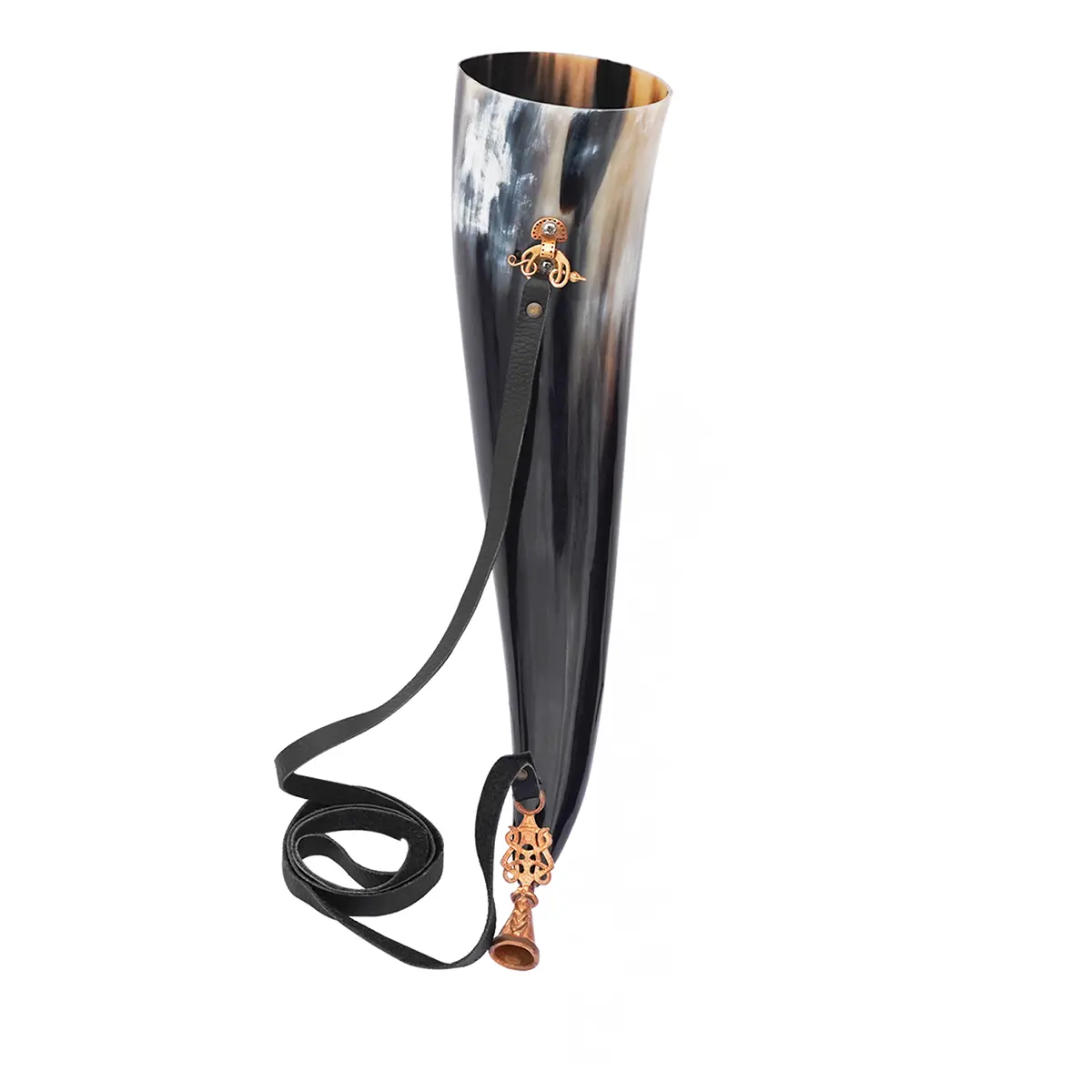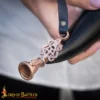 This Viking Genuine Blowing Horn with Lost-Wax Cast Bronze Mouthpiece is a masterpiece of historical craftsmanship, merging the organic beauty of natural horn with the precision artistry of ancient bronze casting. The horn itself is hand polished, allowing its unique coloration to shine, ensuring no two are alike.