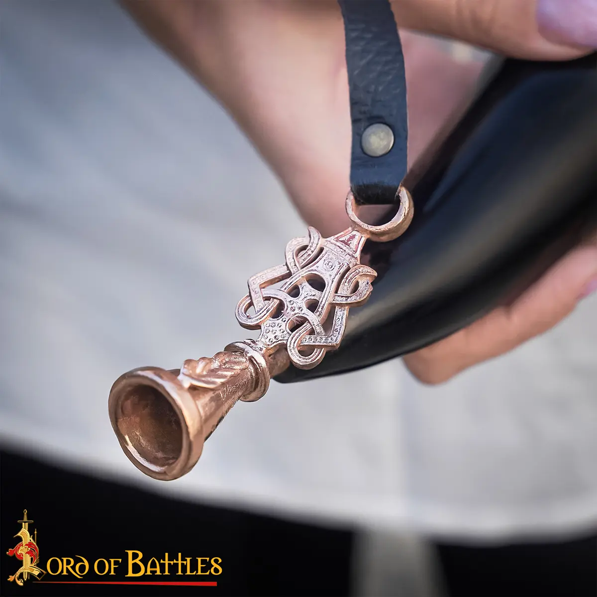 The mouthpiece of the Blowing Horn is created through the lost-wax casting method, a technique dating back thousands of years, allowing for exceptional detail in the intricate Norse knot-work. This traditional process involves sculpting the design in wax, encasing it in clay, melting out the wax, and pouring molten bronze into the cavity—capturing the design in stunning accuracy.