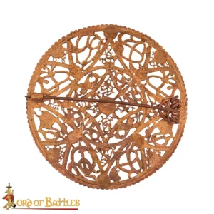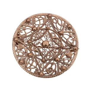 Brooches like this were common in Viking Age dress from the 9th to the 11th century, especially among Norse women. The disc brooch was worn singly or in pairs and often indicated social rank or clan identity. Filigree patterns, like the ones replicated here, originated in early Viking decorative styles and evolved into more complex animal and knot designs by the late Viking Age.