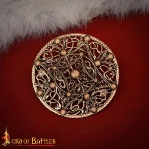 This ornate Viking disc brooch is inspired by 10th-century finds from Scandinavia and the Baltic region. Richly decorated in intricate filigree, the brooch features classic Urnes-style knotwork with symmetric scrolls and spiral motifs—a hallmark of Viking artistry from the late Norse period.