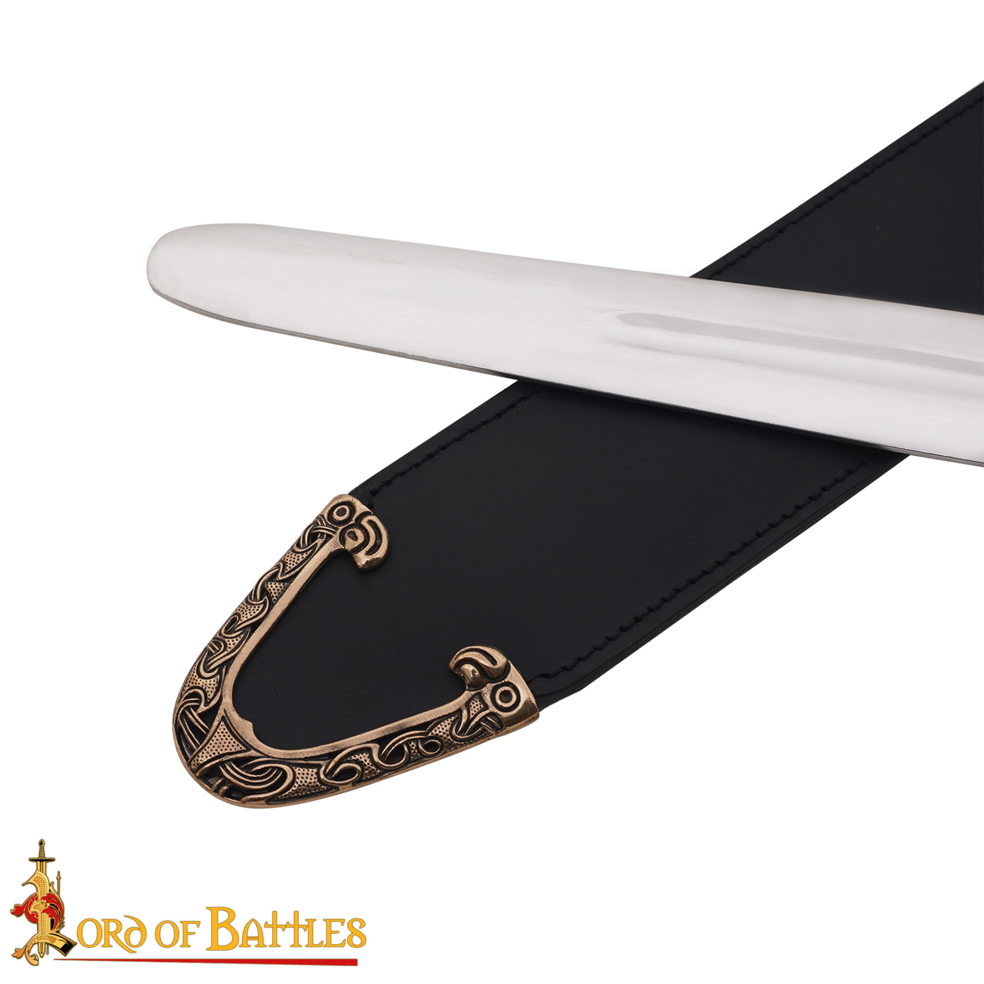 Cast from high-quality bronze using the lost-wax method, this piece shows the knot-work and beast-head designs of Viking metalwork. The antique finish of the Sword Chape gives it a timeworn authenticity, making it perfect for historical enthusiasts, collectors and those wanting to equip Viking swords with accurate fittings.