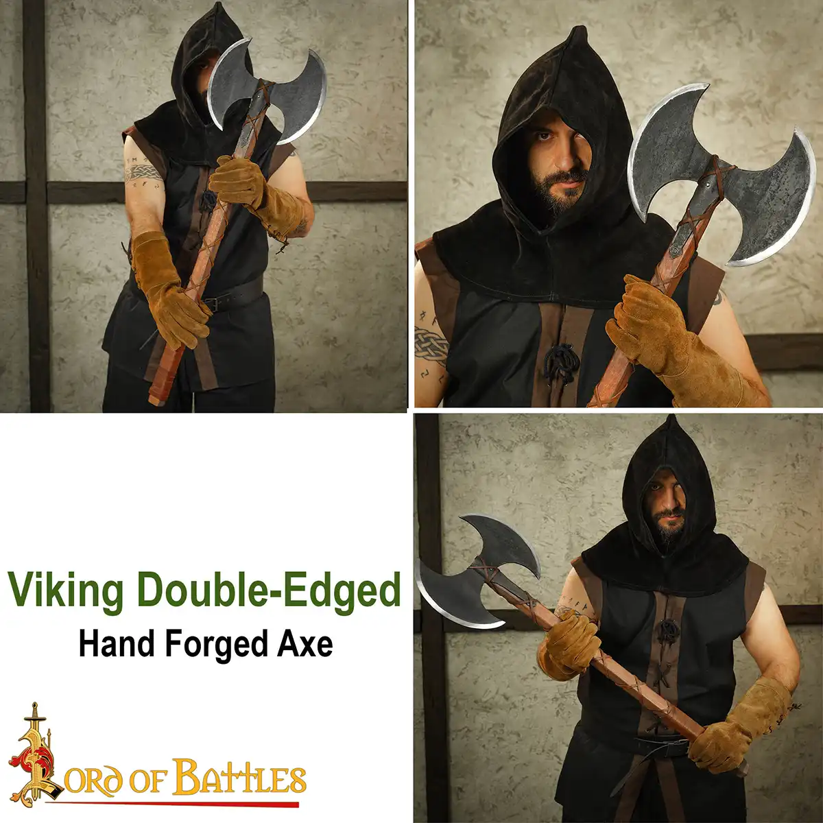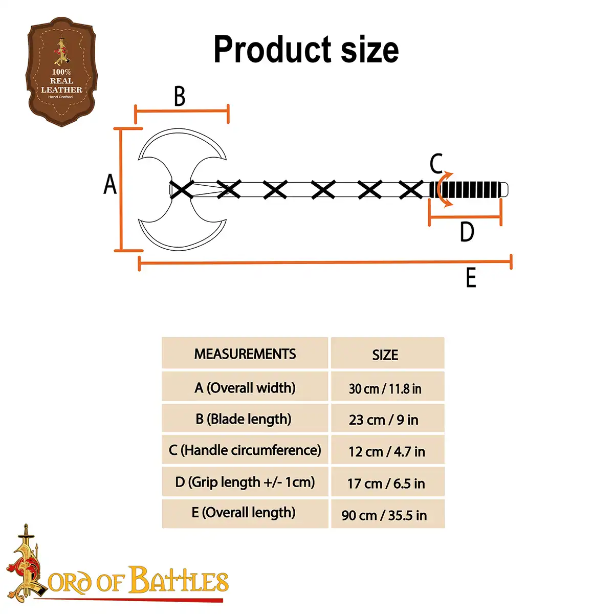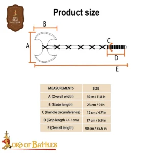 The 13 inches wide head is HAND FORGED from tough CARBON STEEL and makes a FULLY FUNCTIONAL Viking weapon. The handle is crafted from GENUINE HARDWOOD (one version is crafted from sturdy Acacia wood whereas the other version is crafted from sturdy yet lightweight Ash wood), wrapped with GENUINE LEATHER STRING. This axe can be sharpened according to the usage. Its total length is approximately 35.8 inches.