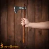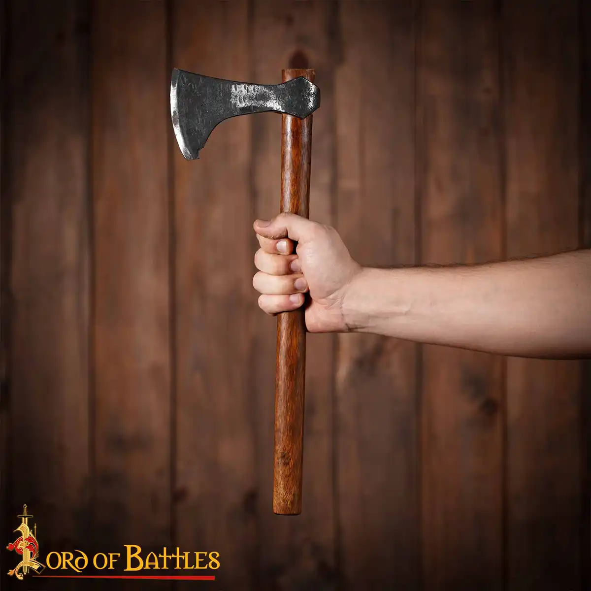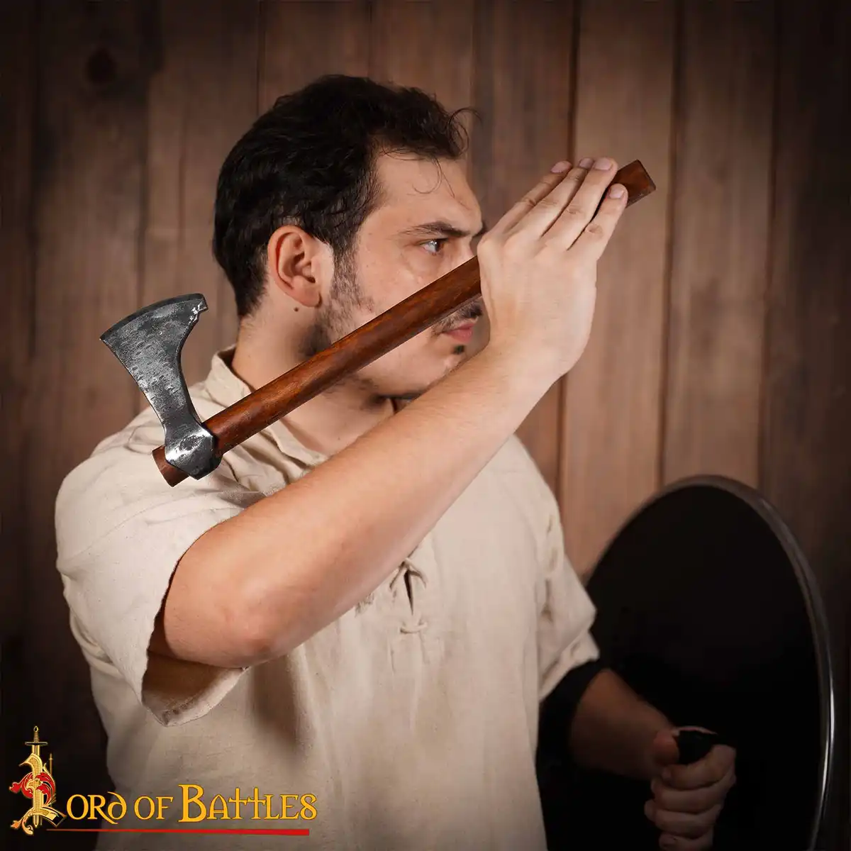 Its mild steel head features a rugged, natural finish—bearing the marks of the hammer for an unrefined, battlefield aesthetic. Forged from High-quality carbon steel, to ensure durability and strength. Carbon steel is renowned for its toughness, edge retention, and resilience, making this axe not just a display piece but ready for battle or training. The curved edge offers a practical shape for both cleaving and chopping, making it ideal for training, cutting tasks, or as part of an authentic Norse ensemble.