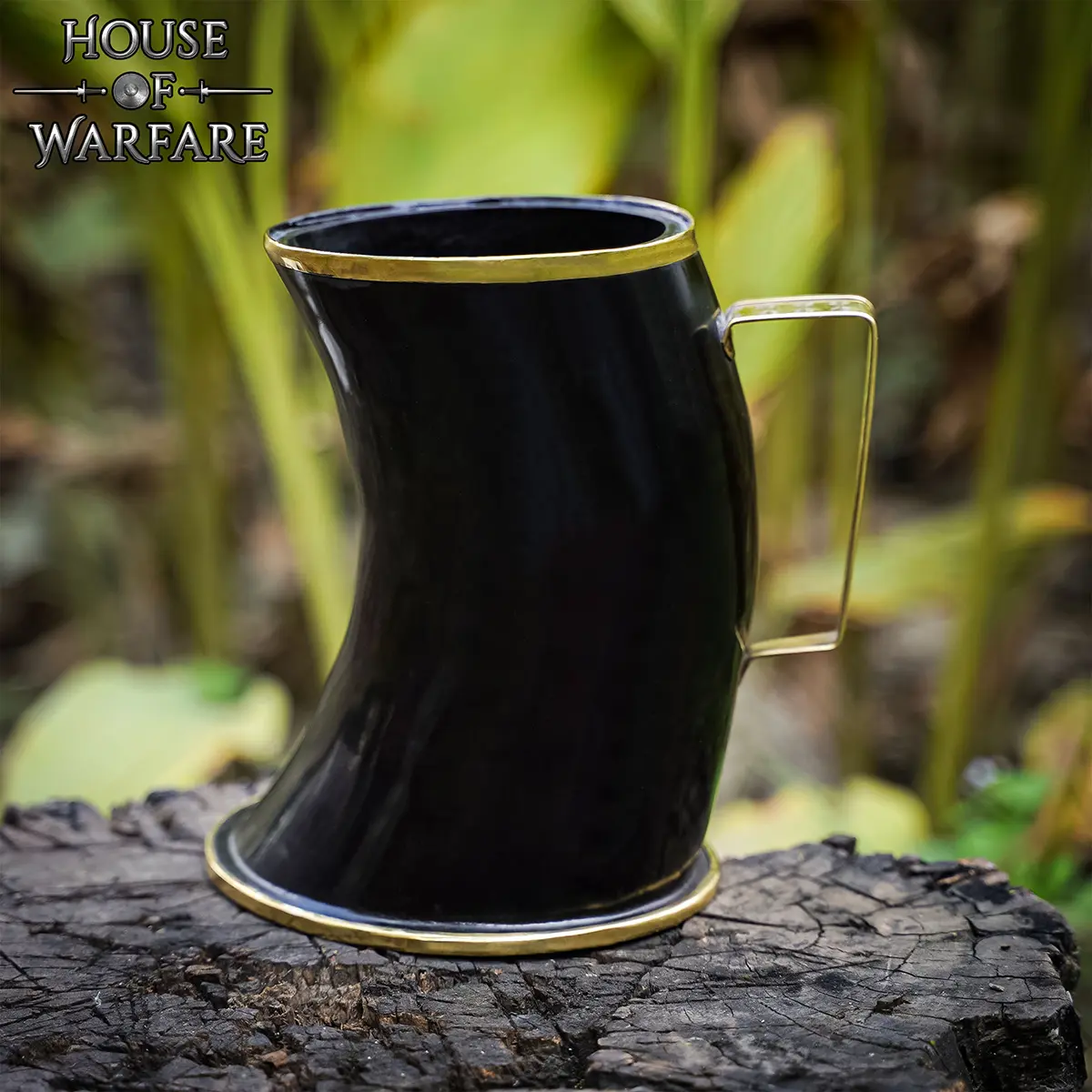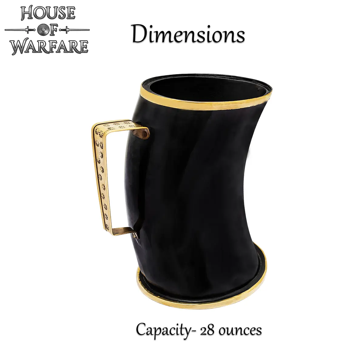 With a generous 800ml capacity, it’s built for deep toasts, long tales, and hearty pours of ale, mead, cider, or your cold beverage of choice. The brass-rimmed lip and base not only add visual distinction but bring out the structure, helping prevent cracking and prolonging its life. The brass handle provides a comfortable grip with a medieval look suited to any shield-bearer or skald.