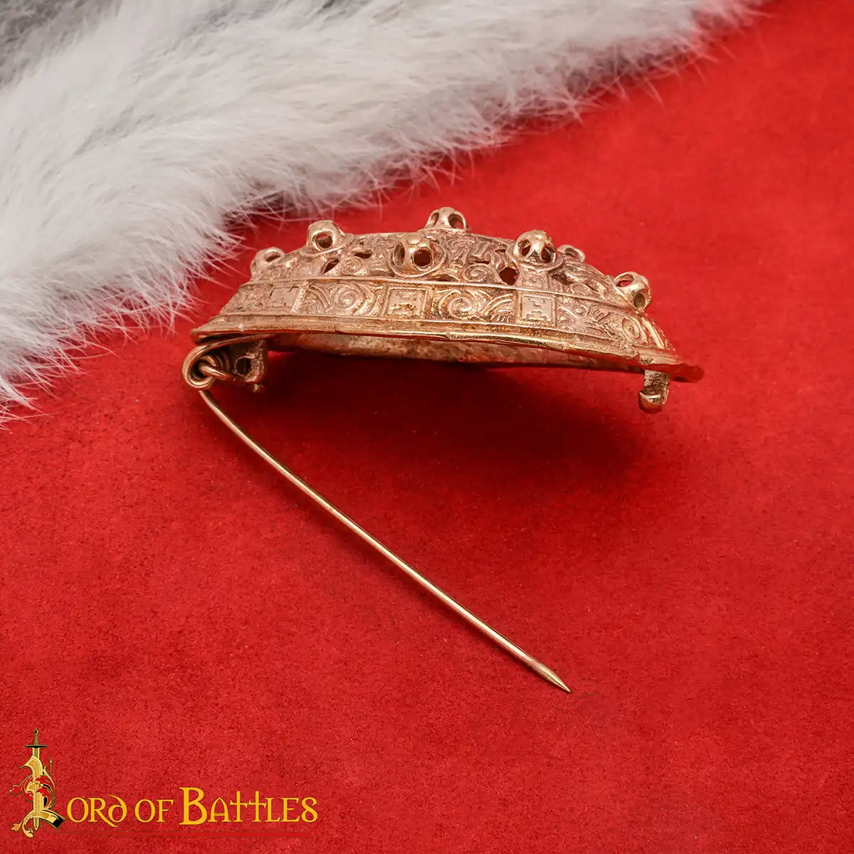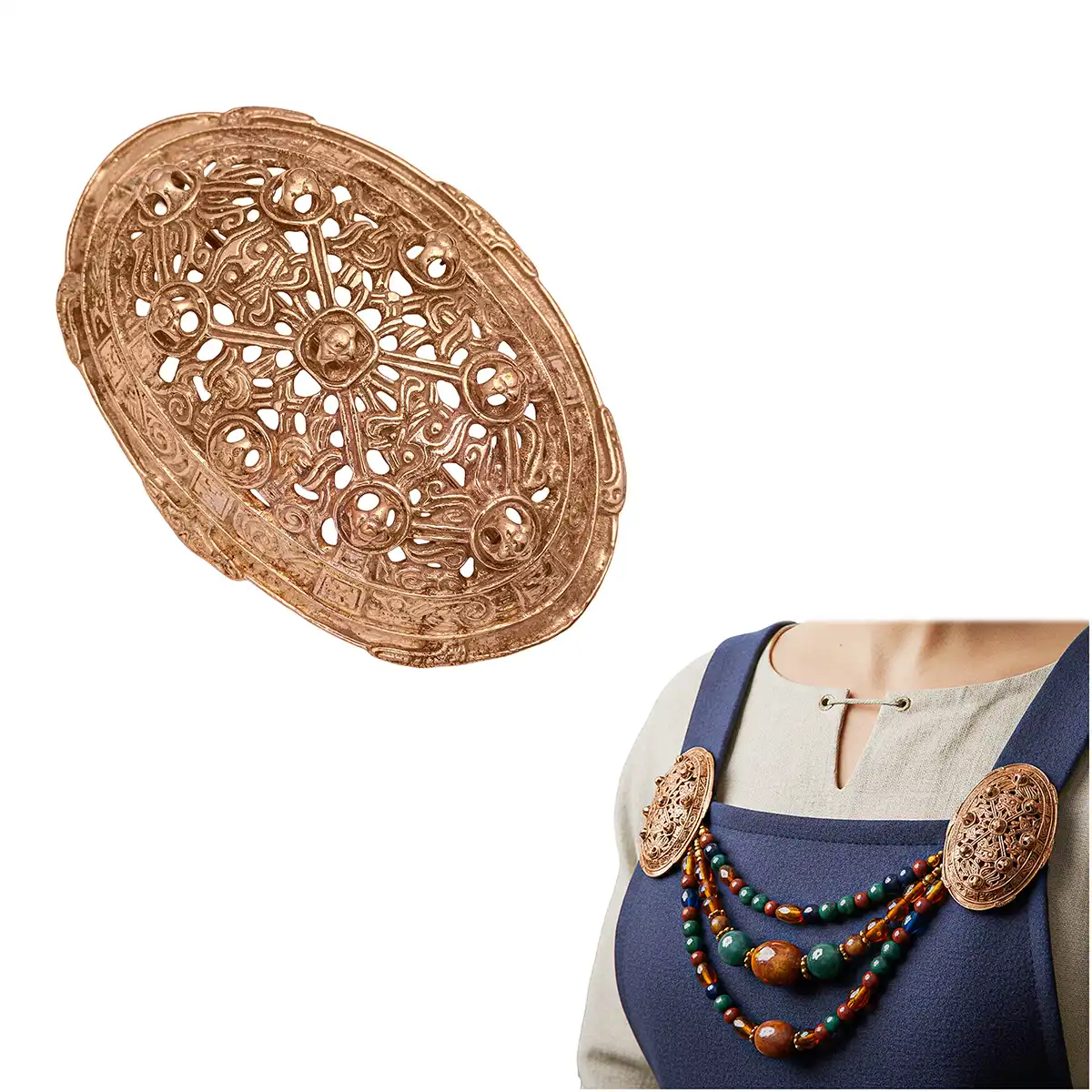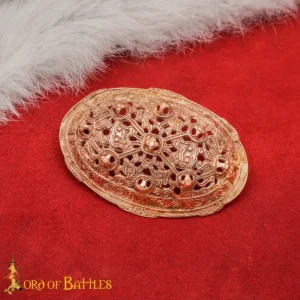 This Viking Oval Brooch Akershus is a solid bronze replica made with the traditional lost wax casting method. The brooch is based on a 9th century Viking Age original which was discovered in the Norwegian region of Akershus. Its shape and detailing is very similar to the historical example, so it is suitable for accurate viking events and display.