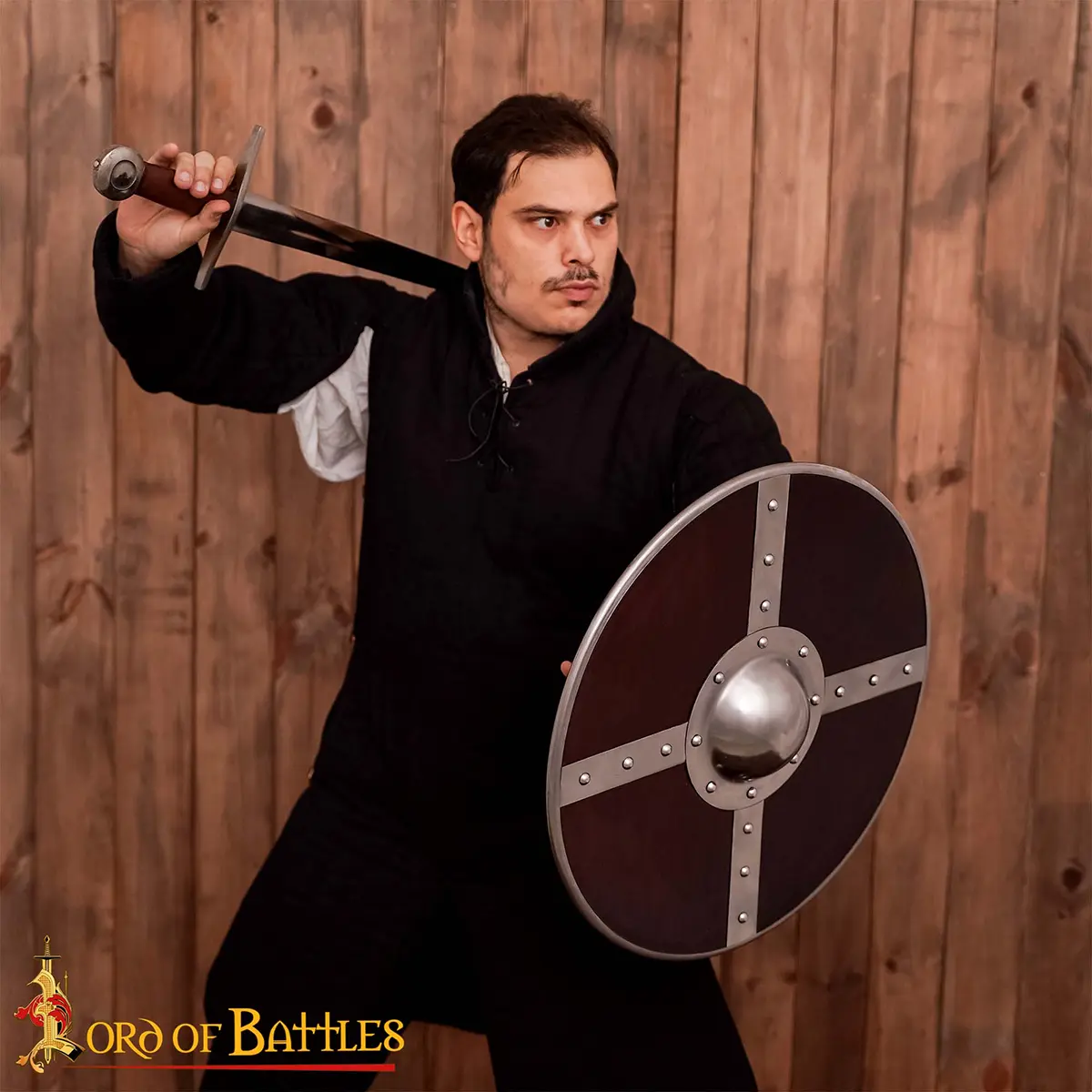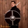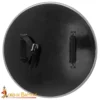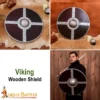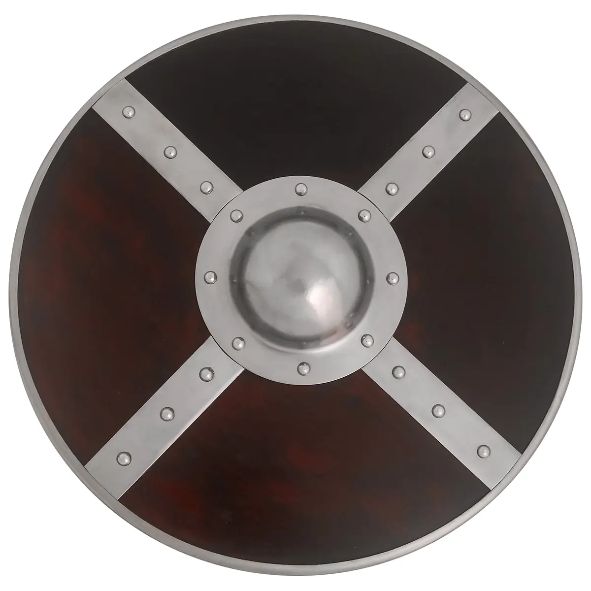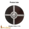 This shield, of approx. 21.5 inches diameter, is meticulously handmade from STURDY GENUINE WOOD. This shield comes with a leather strap and a metal handle, reinforced with a wooden cover for a better grip. The metal details of this shield are made of 18 gauge mild steel, while the umbo is made of 16 gauge mild steel.