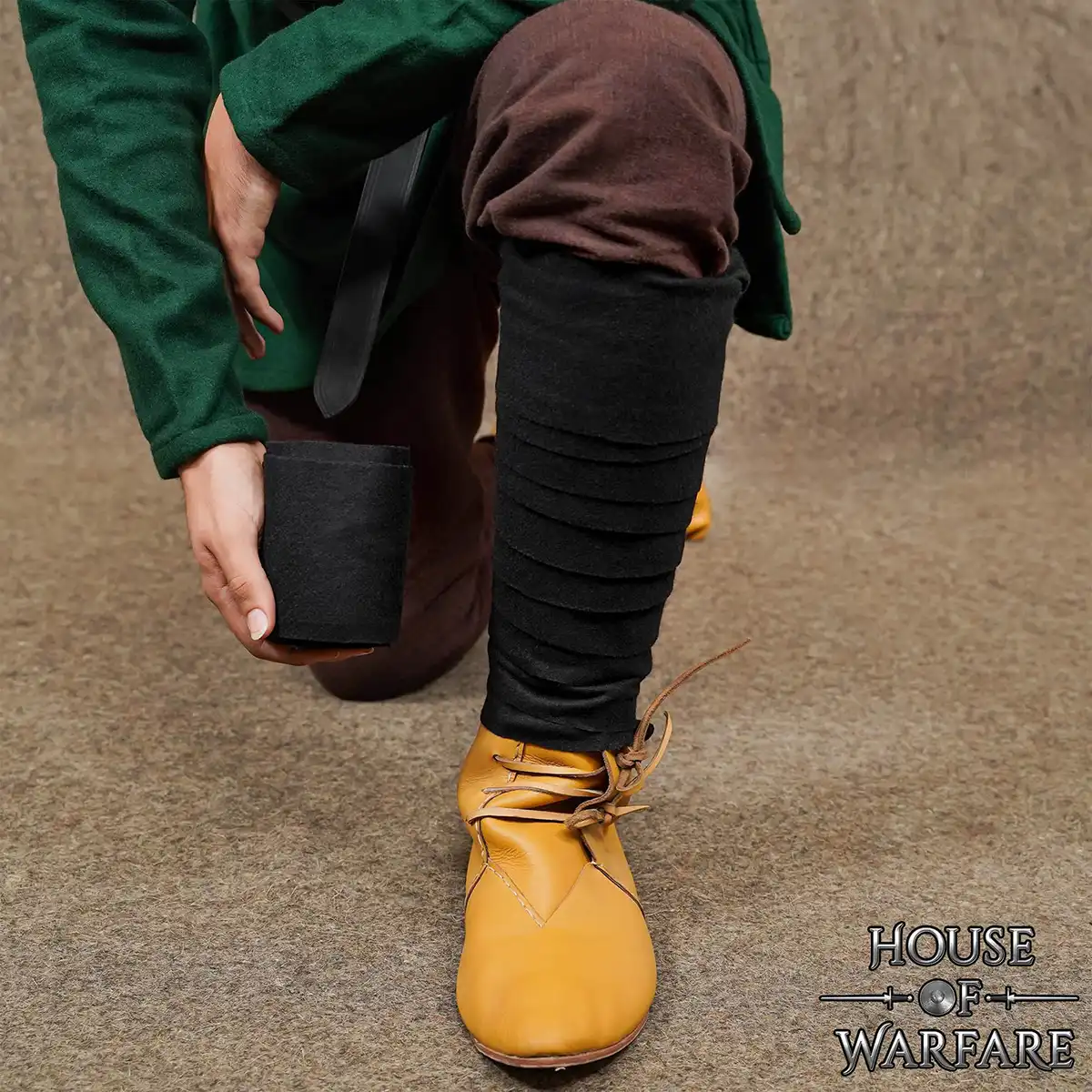Each pair is made from a 70% wool and 30% blended fiber fabric. Wool is naturally insulating, breathable, and moisturewicking. It keeps legs warm. Wool is also durable, slightly stretchable, and resistant to odors, making it ideal for long use of wear during events. These medieval leg wraps measure about 145 cm in length and 4 inches in width, for enough coverage.